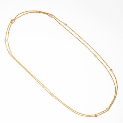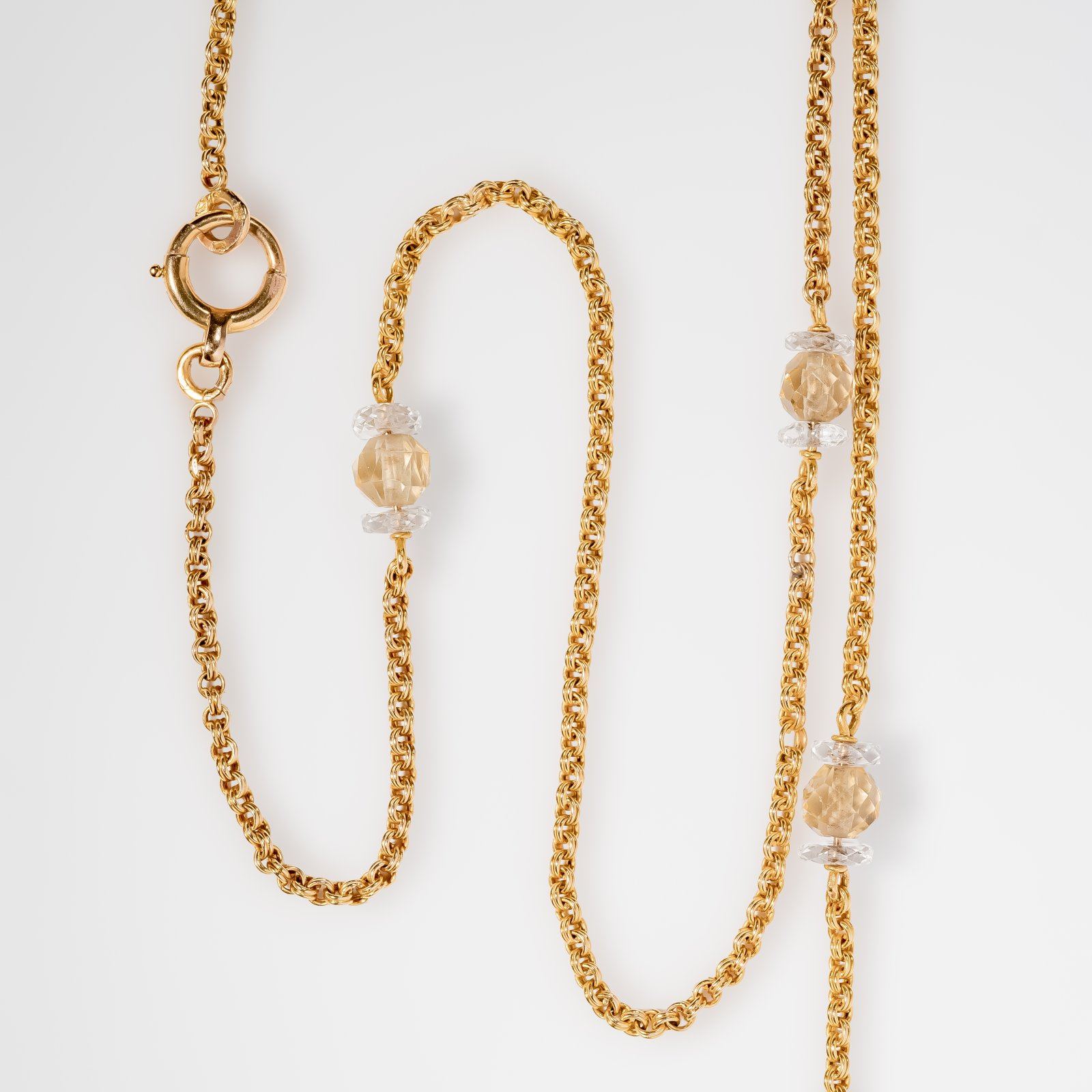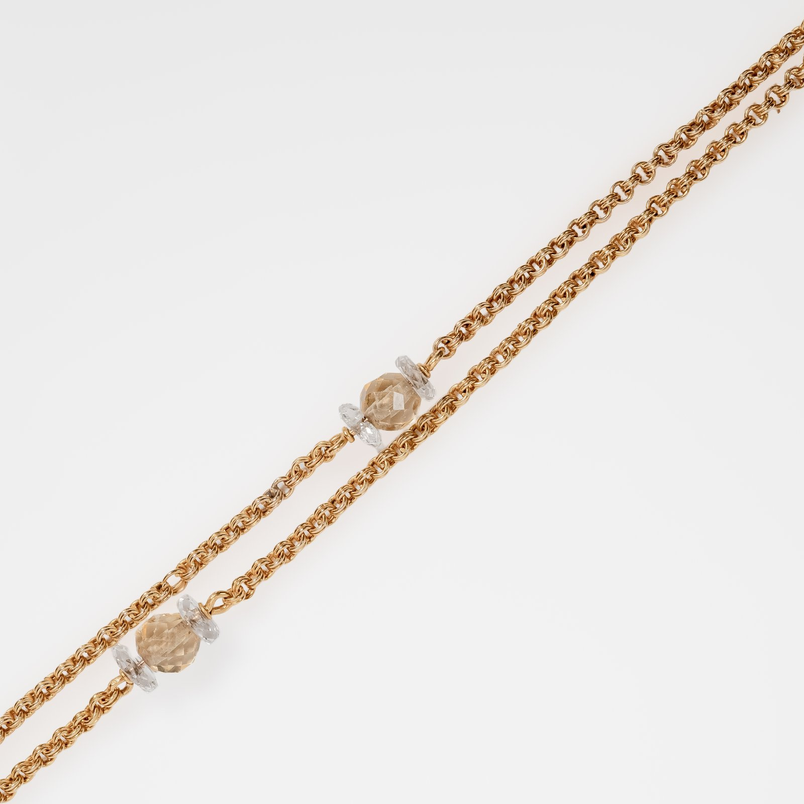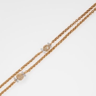 Miękko układający się naszyjnik o pięknym bogatym splocie przetykanym delikatnie połyskującymi kryształami górskimi. Elementy zdobiące wykonane z różnych pasujących do siebie form : fasetowanych kul o miodowo-brązowej barwie oraz spłaszczonych kul o przeźroczystym kryształowym połysku. Niewątpliwym atutem naszyjnika jest jego ponad półtorametrowa długość, która pozwala na dowolną stylizację wokół szyi.