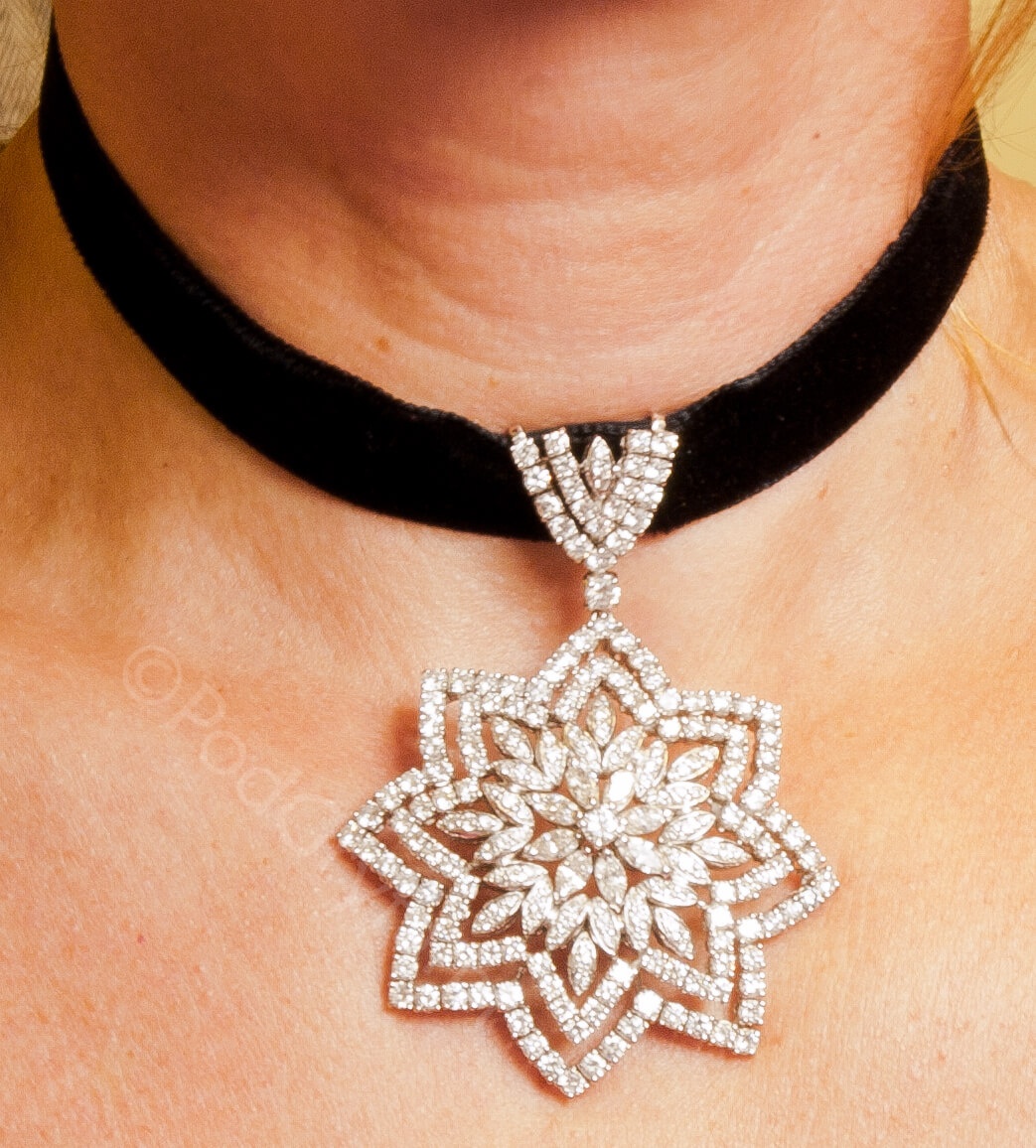 Niezwykły wisior o konstrukcji gwiazdy z wpisanym wewnątrz kwiatem. Doskonale dobrane diamenty różnych szlifów osadzone w dyskretnych oprawach. Idealna dyspersja kamieni podkreślona barwą białego złota.