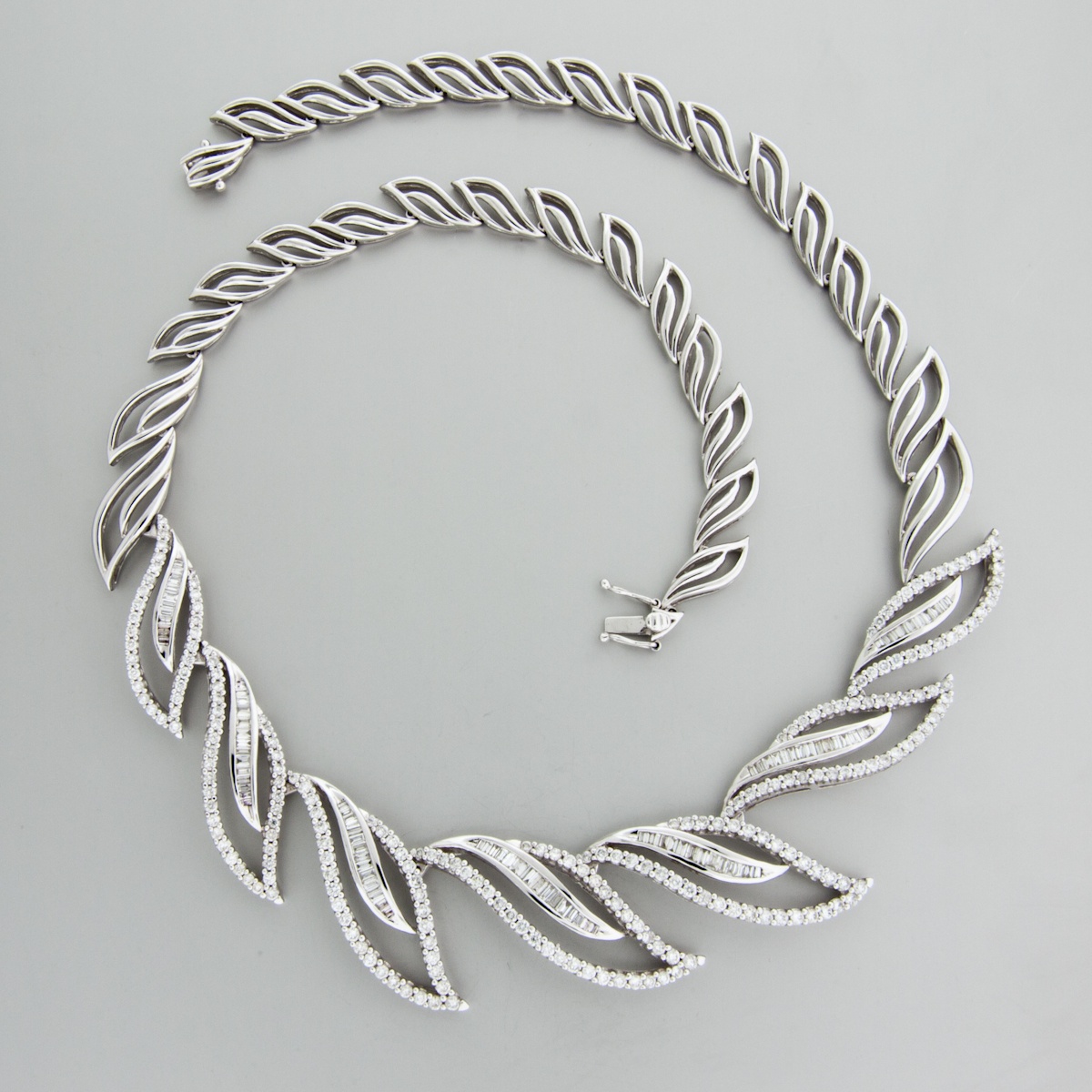 Wijący się wokół szyi skrzący się ponad trzystoma diamentami klejnot może stanowić wspaniałą ozdobę dekoltu w sam raz na wieczorowe wyjście.