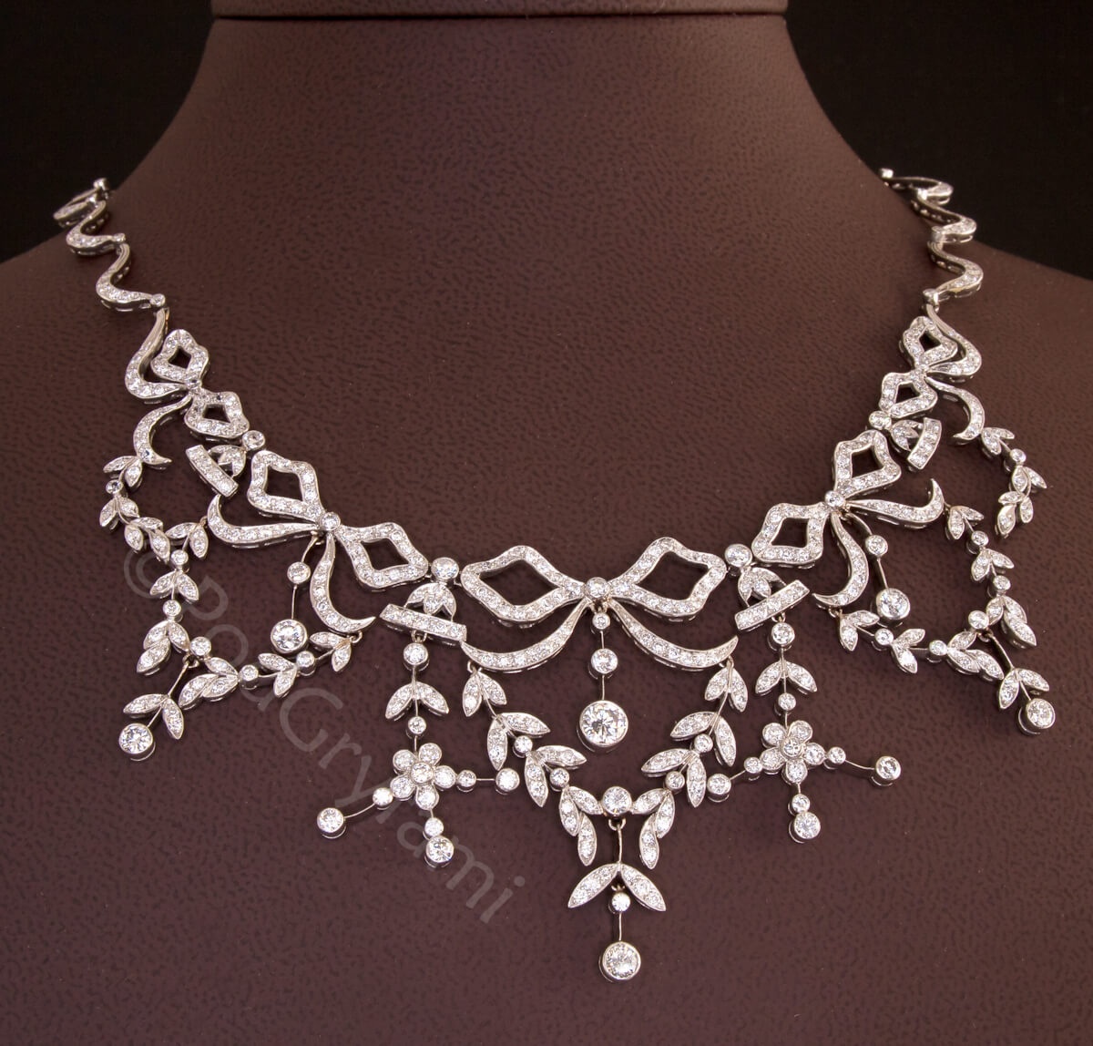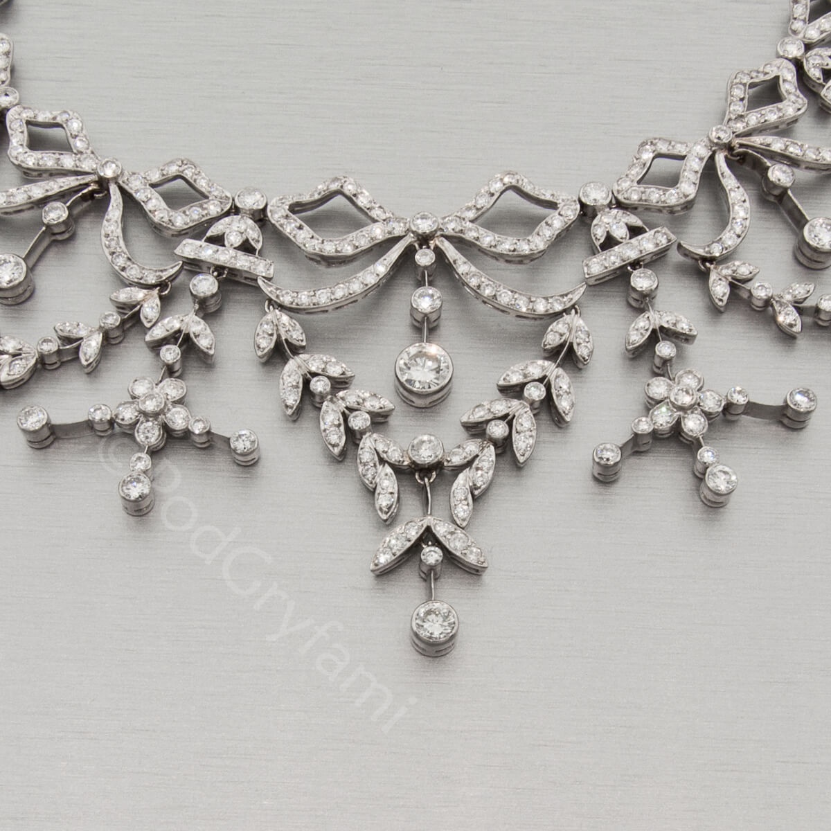 Wspaniały platynowy wyrób zachwyca kunsztem wykonania. Blisko pięćset sztuk diamentów o łącznej masie ponad czternastu karatów ułożonych w finezyjny wzór o motywach florystycznych uczyni dekolt właścicielki brylantowym ,,dziełem sztuki”.