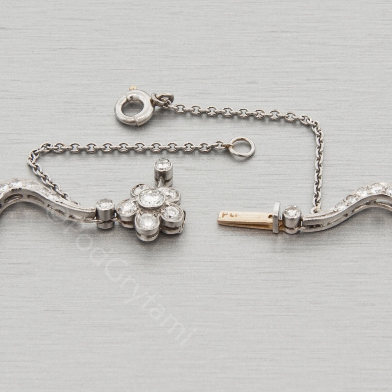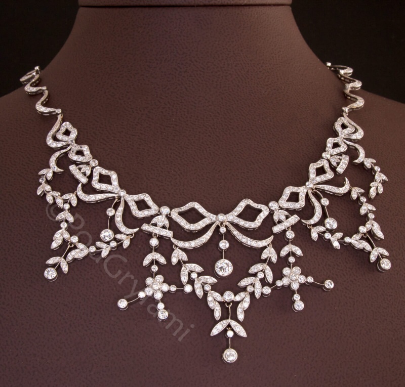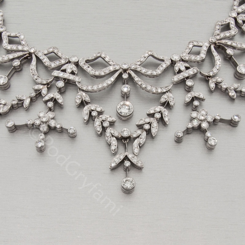 A wonderful platinum piece that displays impressive craftsmanship. The necklace contains nearly five hundred diamonds with a total weight of over 14 carats arranged into a subtle floral pattern that will make its owner's neckline a work of art.