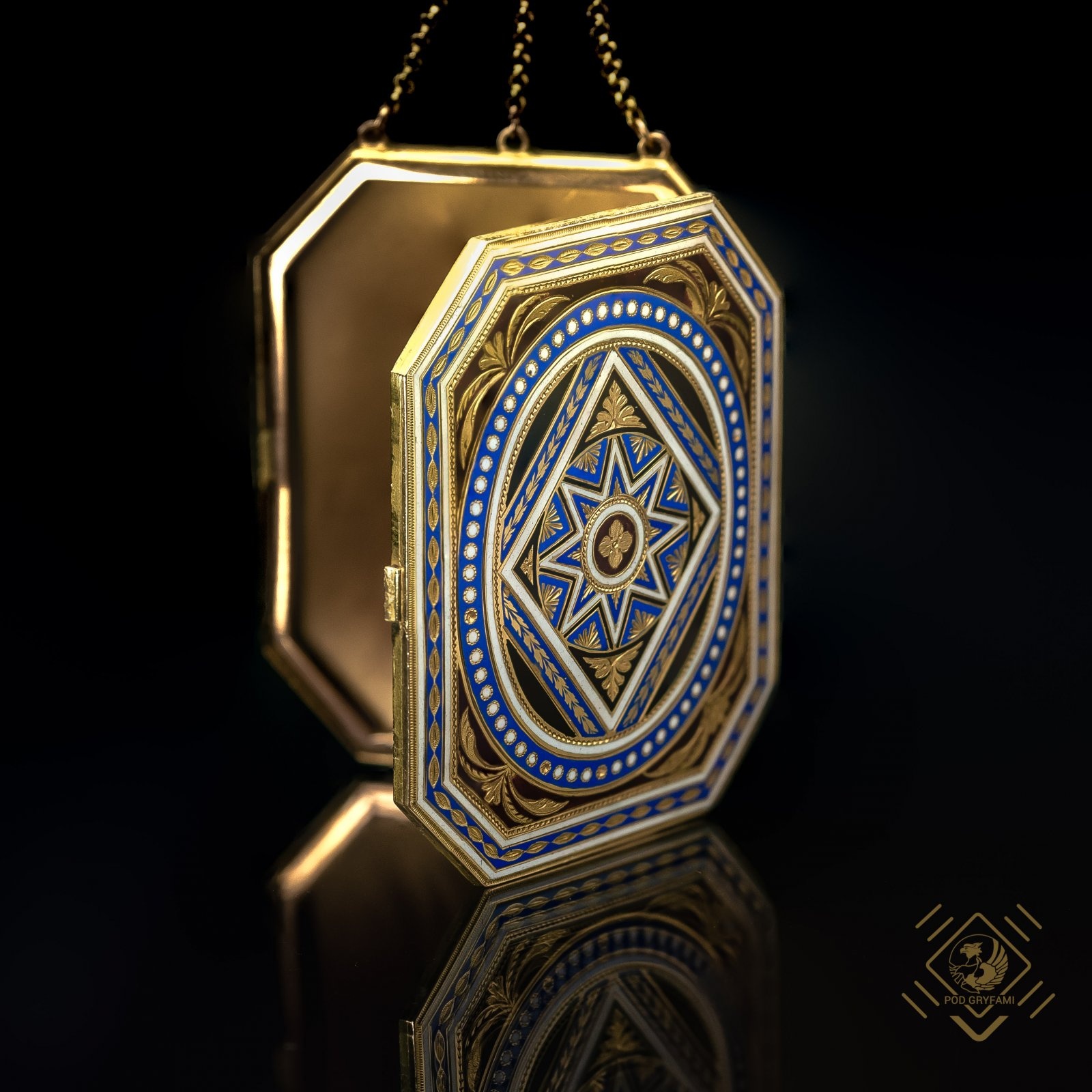 Medalion zwany sekretnikiem wykonany ze złota ozdobiony wielobarwną emalią, datowany na 1885 rok. Schyłek epoki wiktoriańskiej cechował się rozkwitem biżuterii sentymentalnej, w której nurt znakomicie wpisuje się opisywany klejnot. W medalionie poprzez na przykład umieszczenie zdjęcia możemy zamknąć wspomnienie ważnej dla nas osoby. Sekretnik może być również doskonałym uzupełnieniem kolekcji starej , nietypowej biżuterii, czy też ozdobą wieczorowej kreacji.
