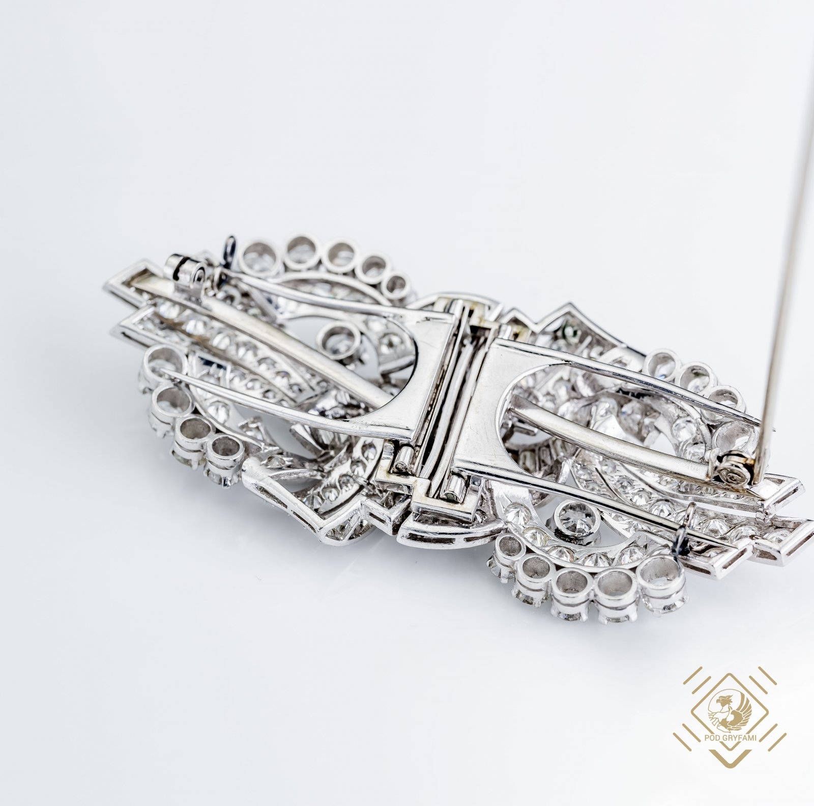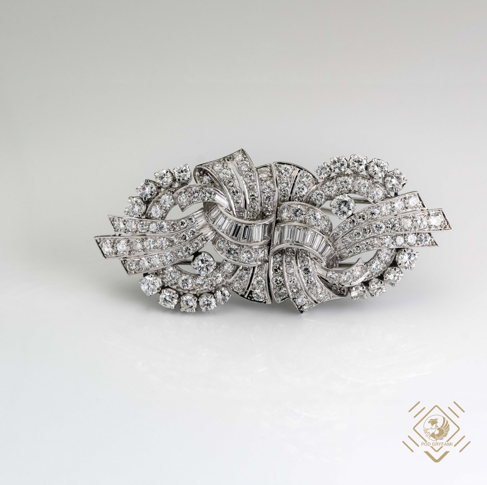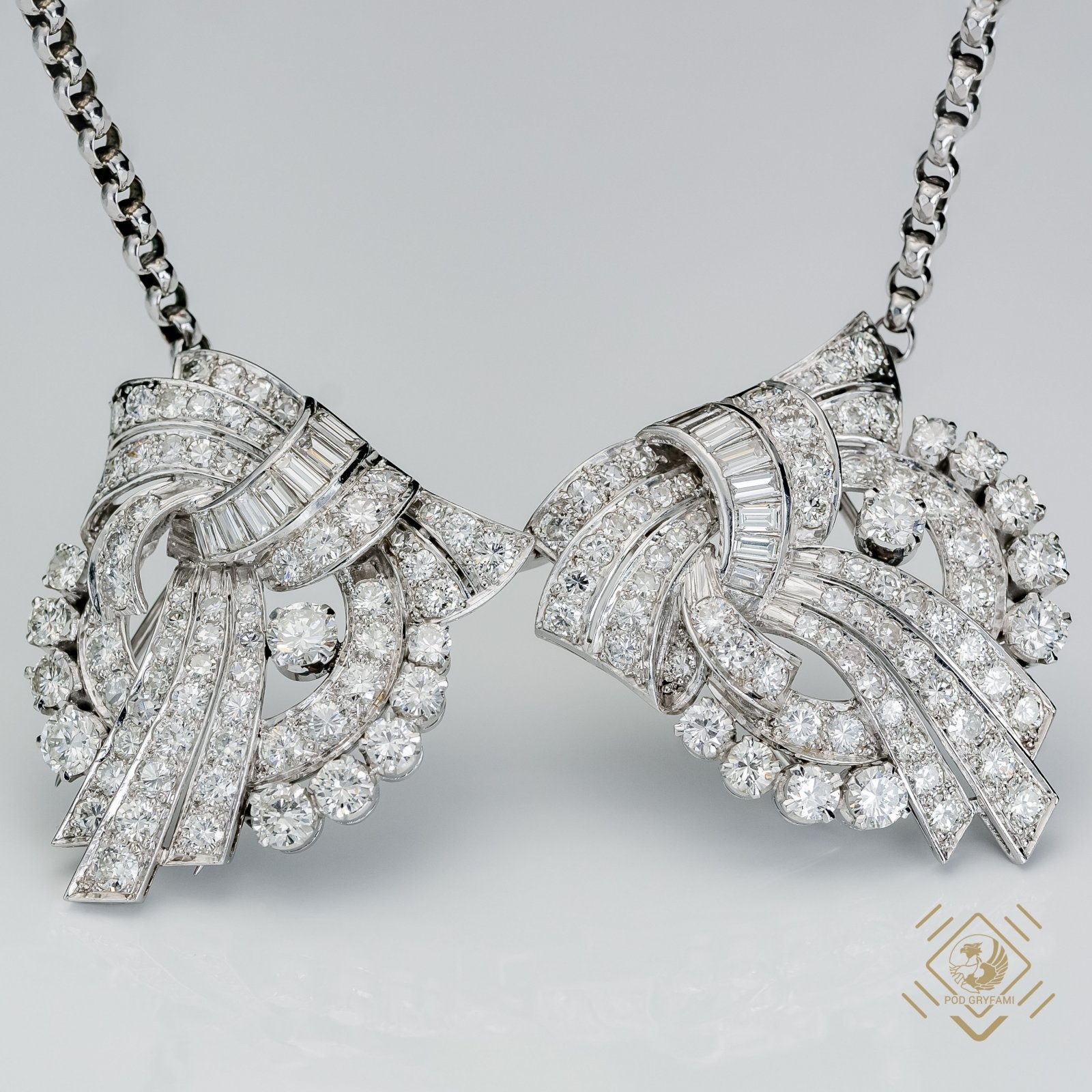 Prezentowany naszyjnik został zaprojektowany jako brosza-clip. Specjalna konstrukcja umożliwia składanie i rozkładanie broszy na dwie części, z których każdą można nosić oddzielnie oraz jako całość z łańcuszkiem w formie naszyjnika lub bez łańcuszka jako typową broszę. Klejnot został wykonany w latach 30-tych XX wieku. Przeplatające się ze sobą platynowe wstęgi ozdobione idealnie dobranymi diamentami o różnych szlifach. Całości dopełnia łańcuszek o specjalnym slocie przekładany fantazyjnymi elementami.