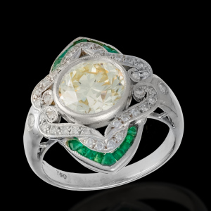 Pierścień ze szmaragdem i rozetami diamentowymi