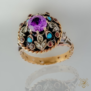 Pierścień z rozetami diamentowymi, turkusami i rodolitami.