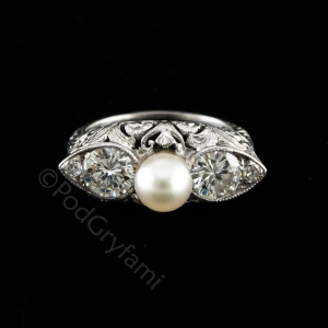 Pierścionek ze szmaragdem, rozetami diamentowymi i perełkami