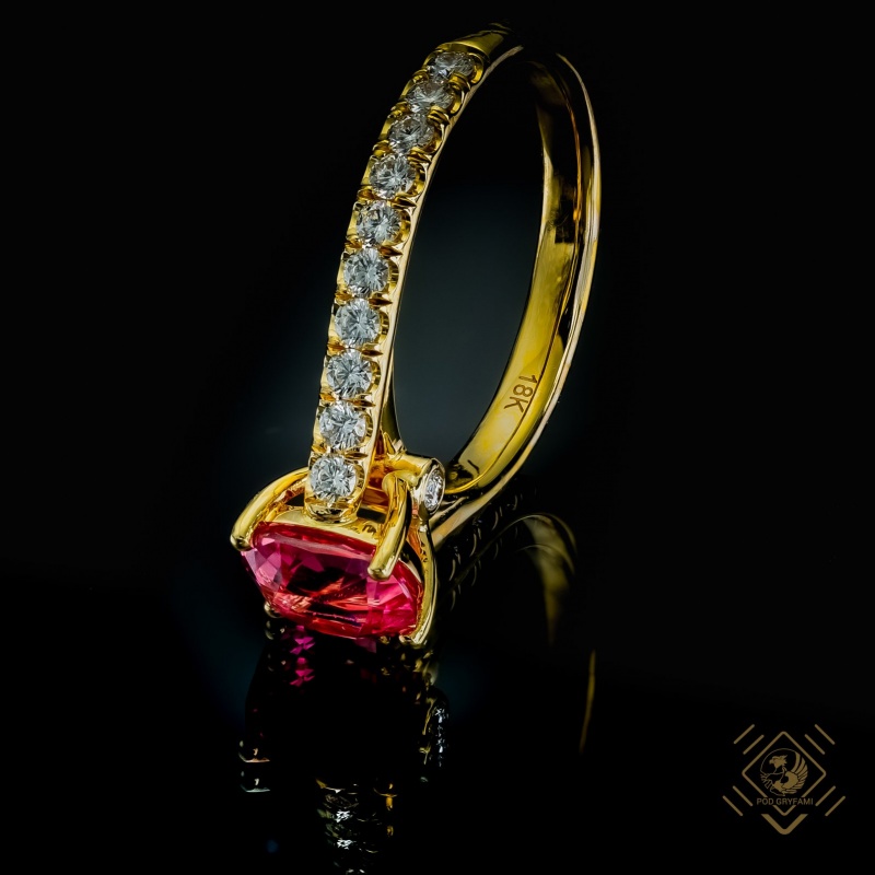 Straight set extremely rare natural pink spinelle, giving the effect of sparkling pink champagne. Due to its rarity and variety of colors, spinelle is one of the most valued colorful gemstones in jewelry. This ring originates from Vietnam from the Luc Yen district mine. The ring is decorated with perfectly proportioned small diamonds. In addition, a setting including the spinelle is decorated with two diamonds in a continuous setting. This unusual jewel is a "drop of pink champagne" among diamonds.