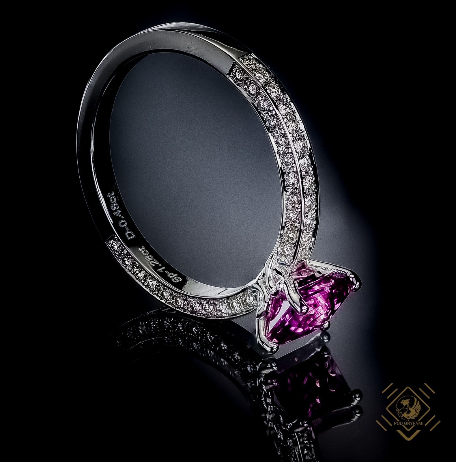 Wykonana z 18 karatowego białego złota obrączka ozdobiona gęsto osadzonymi idealnie okrągłymi diamencikami, której centralnym punktem jest ciemnofioletowy spinel. Ten wysoko ceniony w jubilerstwie kamień szlachetny pochodzi z wietnamskich złóż dystryktu Luc Yen. W naturze występuje w postaci ośmiobocznych, ostrokrawędzistych kryształów a nazwę swą zawdzięcza łacińskiemu słowu [spine] oznaczającemu cierń, strzałę. Spinel według medycyny niekonwencjonalnej wspomaga leczenie wielu chorób. Piękna ozdoba kobiecej dłoni.
