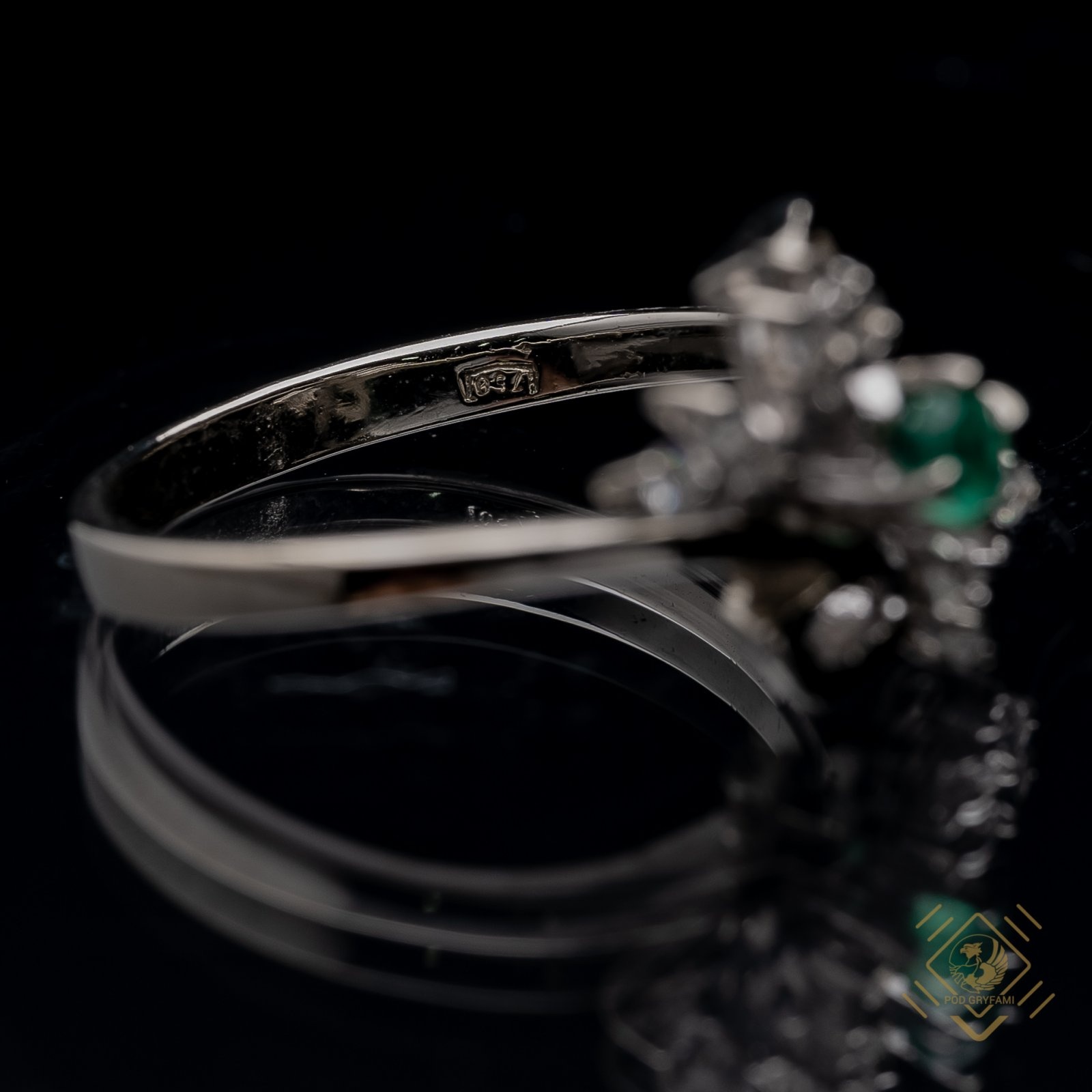 Fantazyjny wzór z białego złota ozdobiony szmaragdem oraz diamentami.