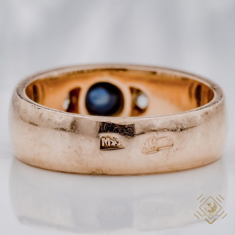 14 carat gold ring with a centrally placed cabochon sapphire and two diamonds surrounding it.