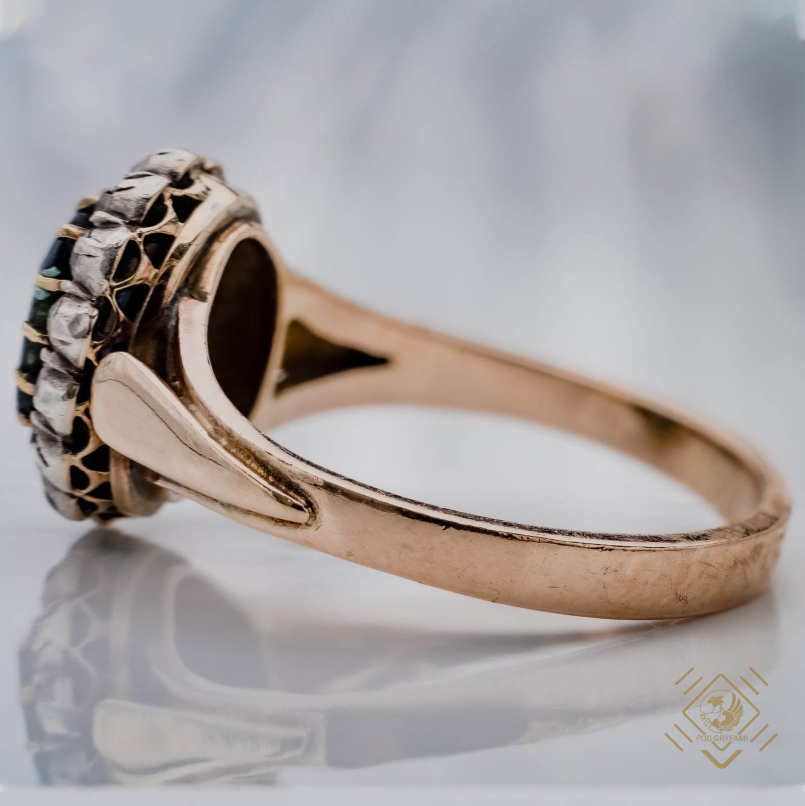 Typowa markiza z centralnie osadzonym szafirem w otoczeniu niewielkich diamentów.