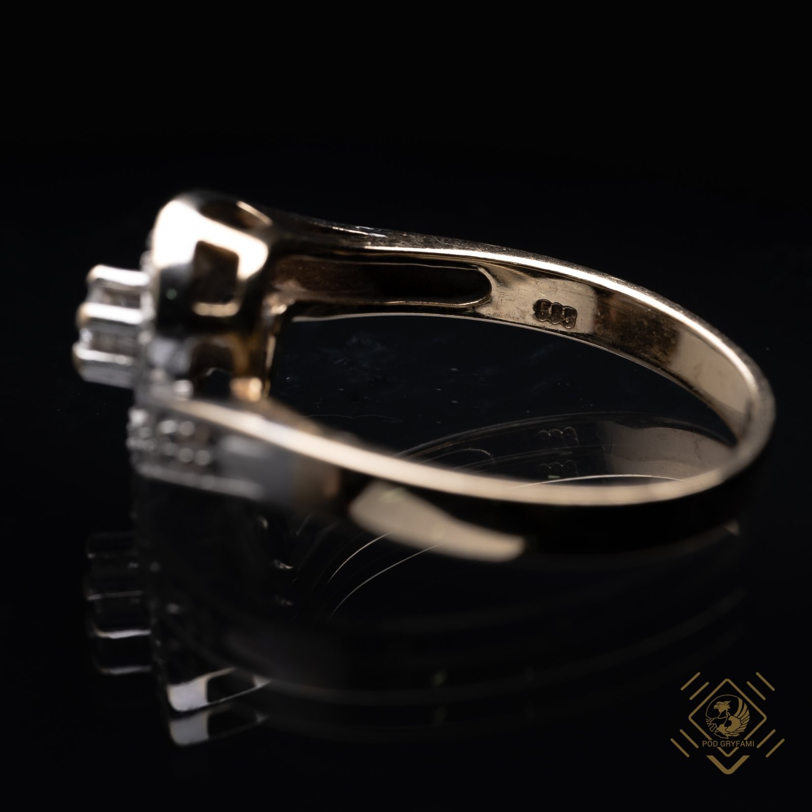 Niewielki osadzony centralnie w splocie dwóch fal diament, którego blask potęgują drobne diamenciki wypełniające kształt fali.