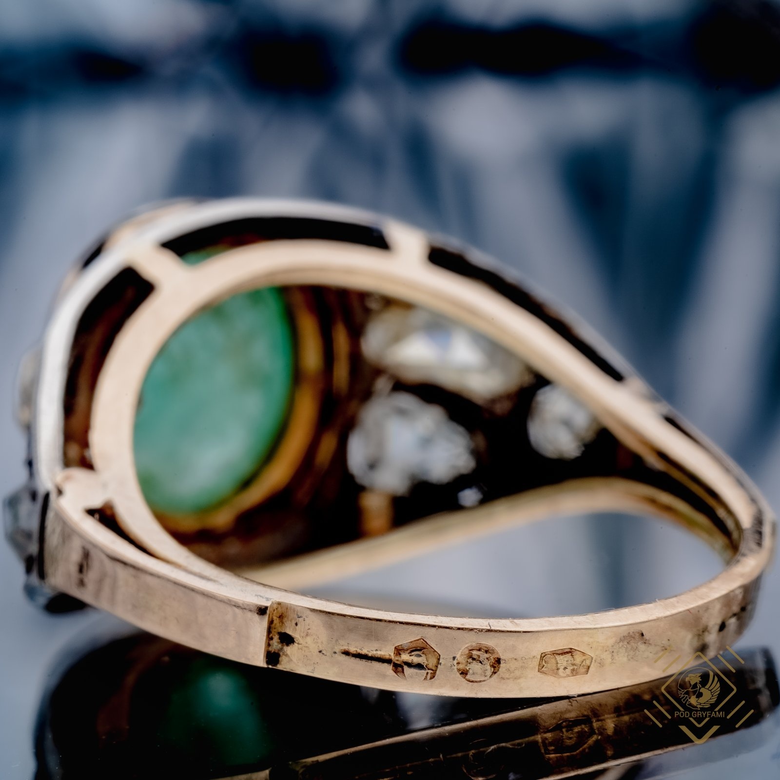 Rzadki okaz pierścienia z przełomu XIX i XX wieku. Na pierwszym planie szmaragd kaboszon w oprawie ciągłej. Z każdego boku po trzy rozety diamentowe. Całość ujęta w opływowy kształt zdobiony techniką millegrainu.
