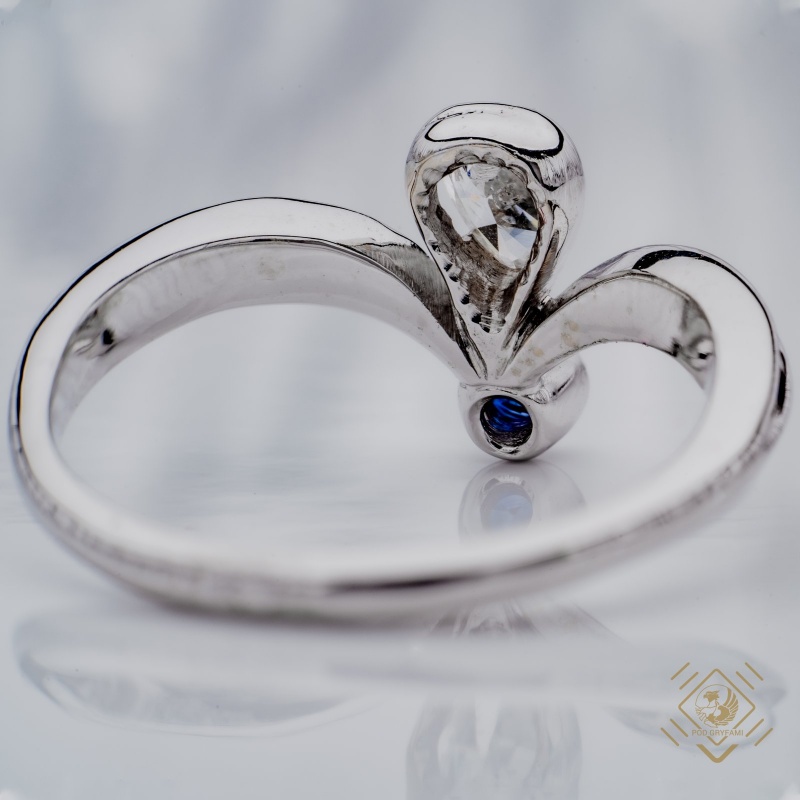 A subtle feminine form. Pear cut diamond accompanied with a small but intensely blue sapphire stone.