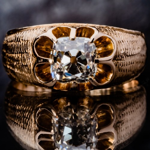 Ponad karatowy diament starego szlifu o rzadko spotykanym kształcie poduszkowym. Kamień nie modyfikowany ujęty w osiem łapek szerokiej w połowie cyzelowanej złotej obrączki. Unikatowy choć prosty klejnot o nieprzemijającym pięknie diamentu dawnego szlifu.