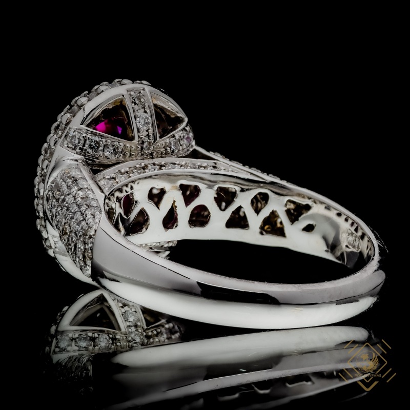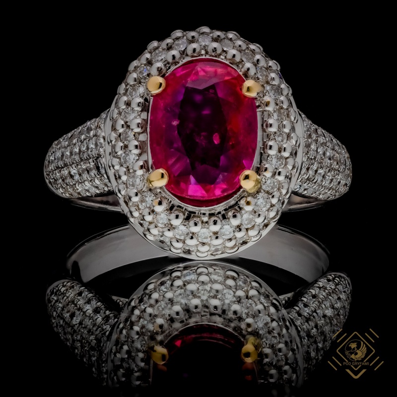 The Mogok Valley of Upper Myanmar has been the main source of rubies in the world for centuries. The most unique stones come from the deposits of this region, but these supplies have shrunk significantly in recent years. The piece presented here is a diamond encrusted ring with a rare ruby from this part of Burma. The very intense, deeply saturated red color of the corundum, matches the shiny perfection of the diamonds.