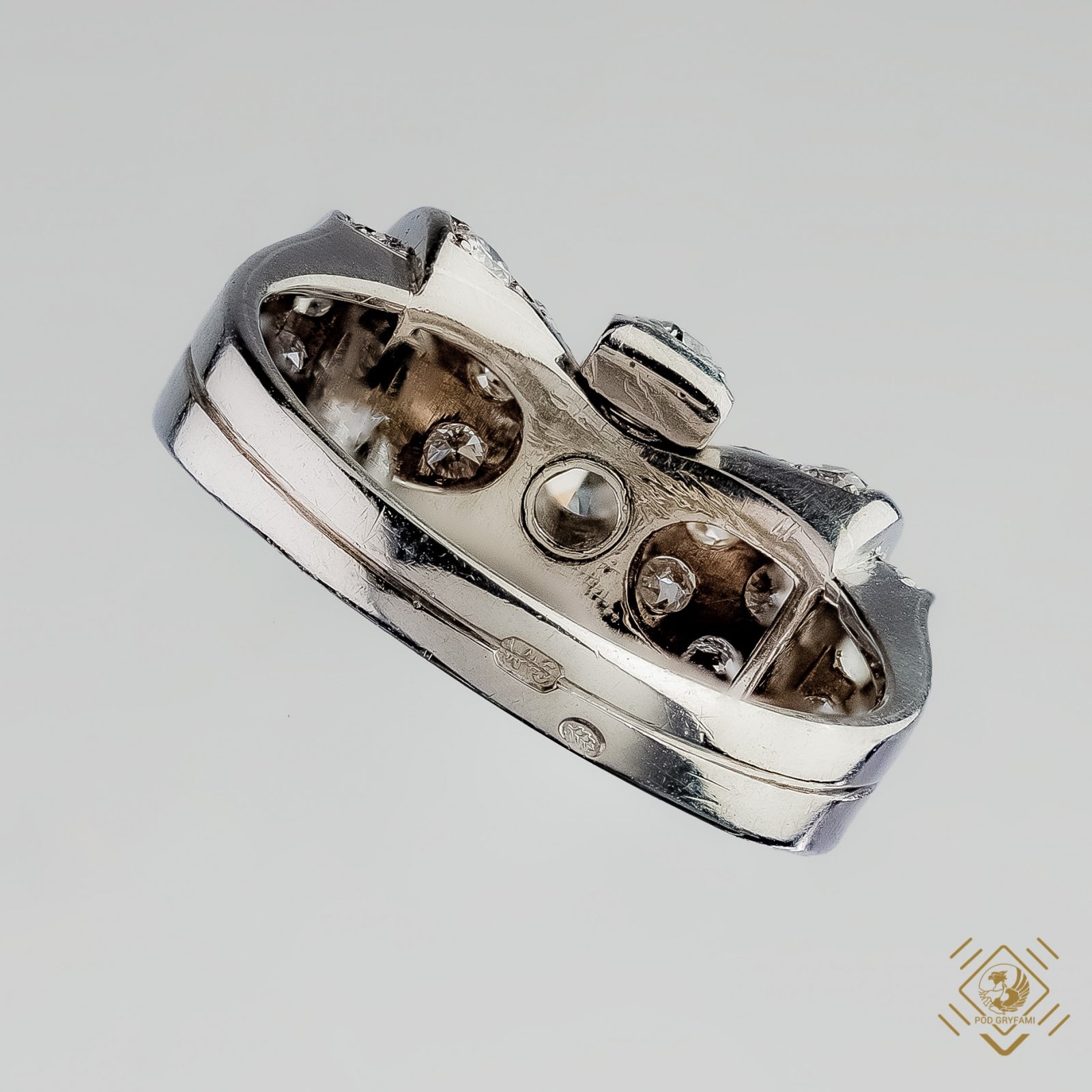 Rzadko spotykana konstrukcja pierścionka nawiązująca w swojej formie do niezwykle lekkiego sygnetu w połączeniu ze wspaniałą brylancją diamentów osadzonych w białym złocie stanowią kwintesencję stylu Art Deco. Wykonany w jednej z holenderskich pracowni złotniczych w latach 30-tych pierścień poprzez absolutnie unikatowy i niepowtarzalny design doskonale oddaje klimat epoki.