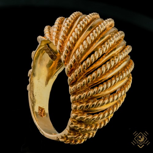 Niezwykły pierścień wykonany ze złota techniką zwaną ,,fil d`ange" lub ,, anielskim drutem" połączony w cieniutkie sznury przypominające muszlę morską.