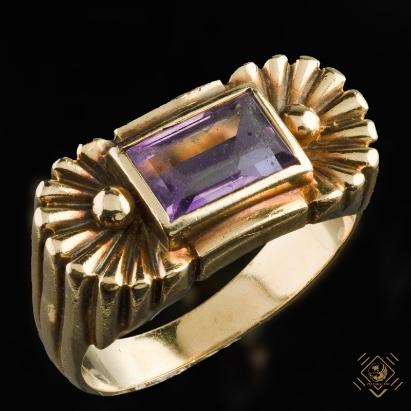 Classic Art Deco. Amethyst has been embedded in a rectangular form. The ring is decorated with side channeling. Slight damage to the amethyst does not affect the artistic value of the ring itself.