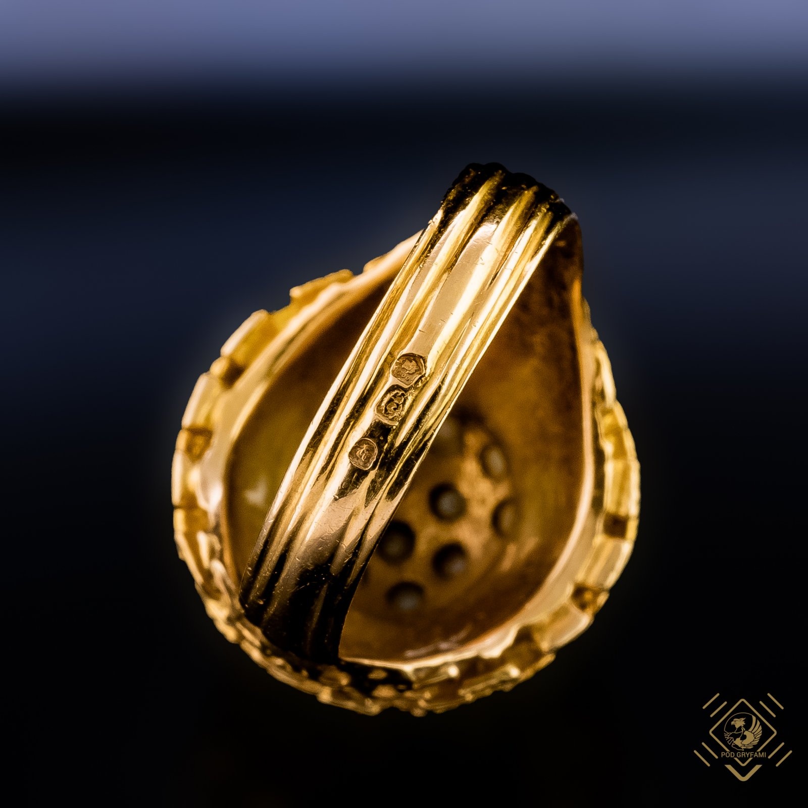 Wspaniała kopułowa konstrukcja ozdobiona niewielkimi perełkami głębinowymi przetykanymi drobnymi złotymi kulkami. Oryginalna perłowa dekoracja połączona z kunsztem jubilerskiej pracy w cyzelowanym złocie.