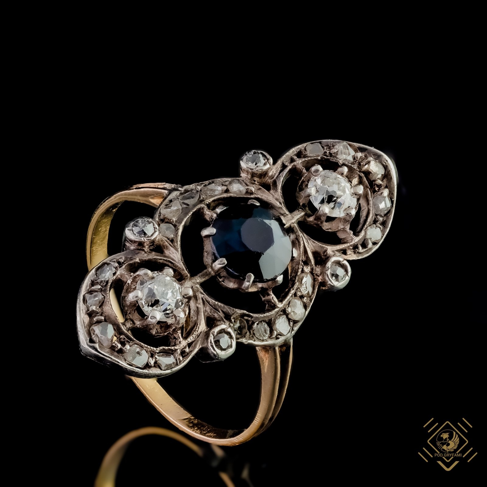 Pierścionek z szafirem i diamentami starego szlifu