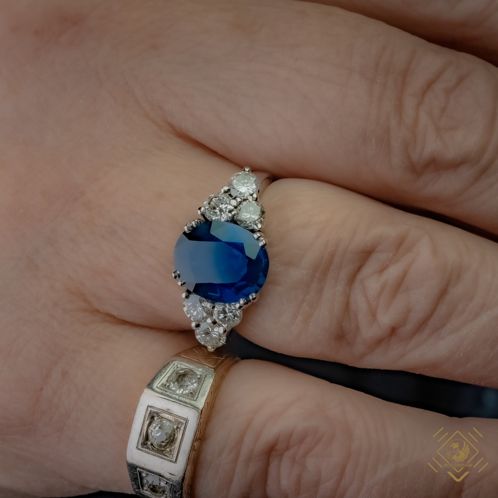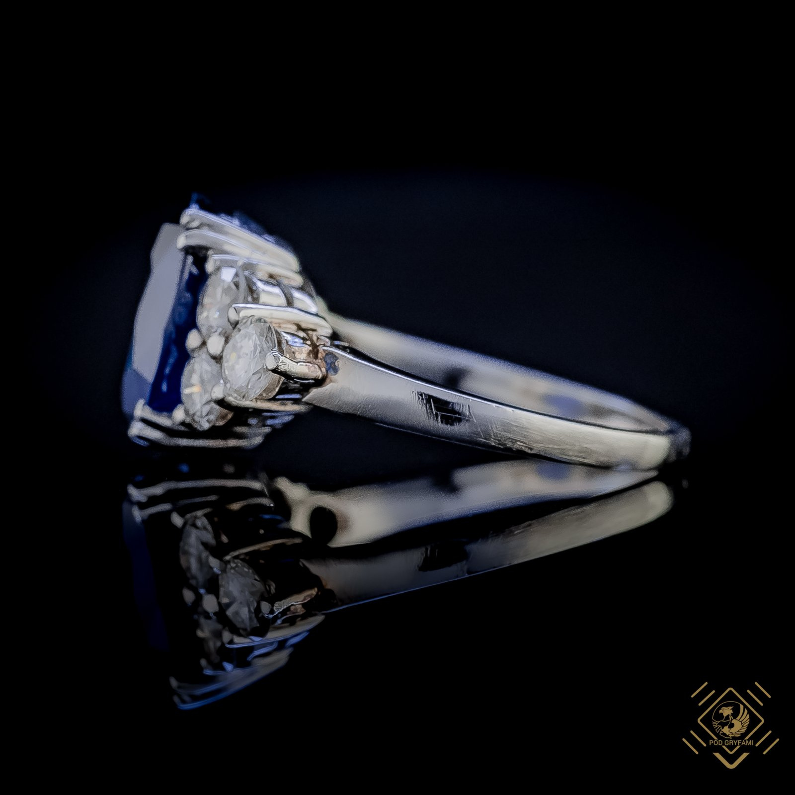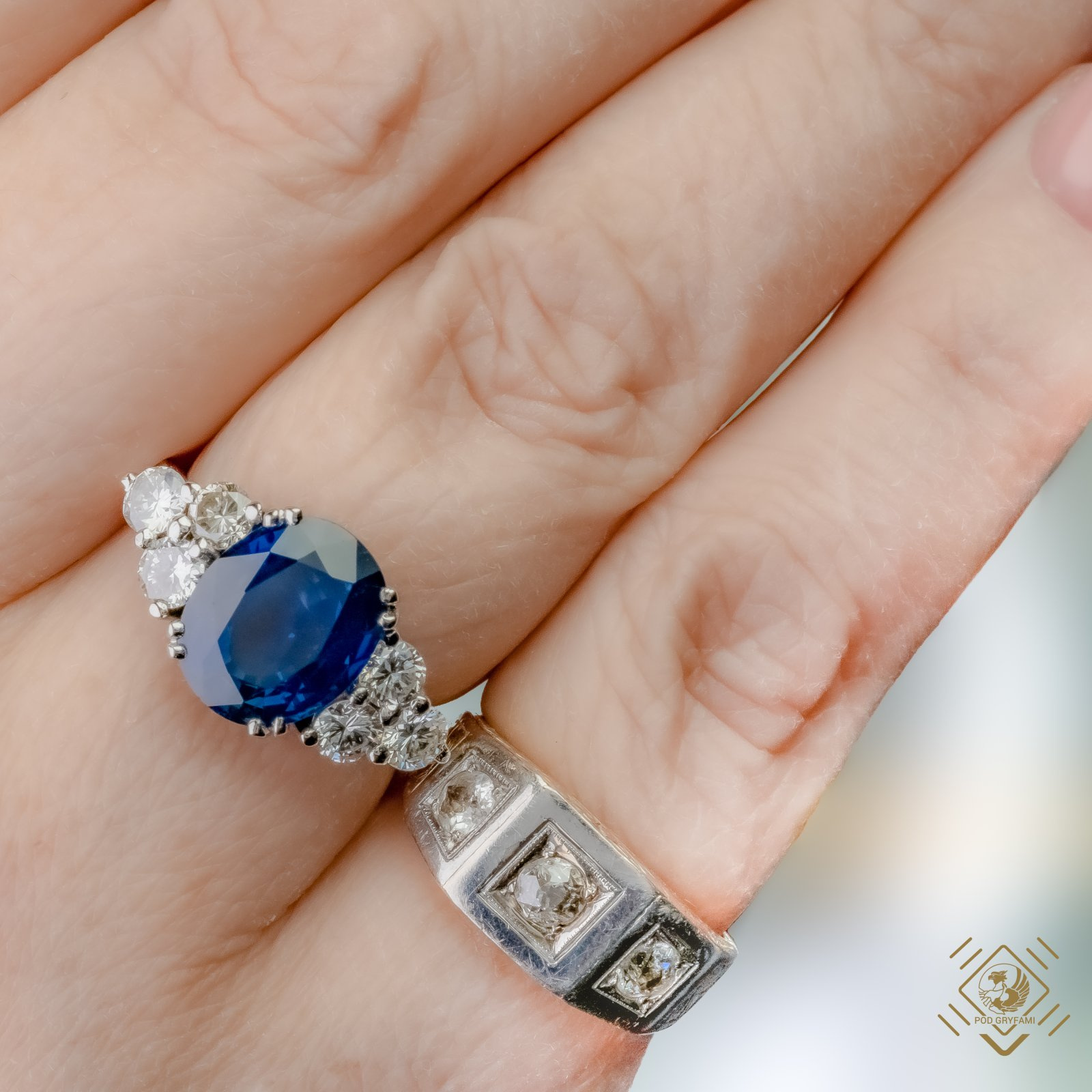 Prosta platynowa oprawa, której zadaniem jest wyeksponować pięcio-karatowy szafir osadzony w towarzystwie idealnie dobranych diamentów. Doskonała brylancja kamieni wspaniale podkreśla głęboki błękit korundu.