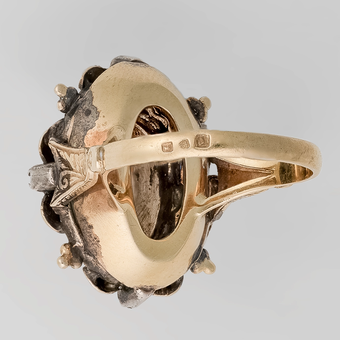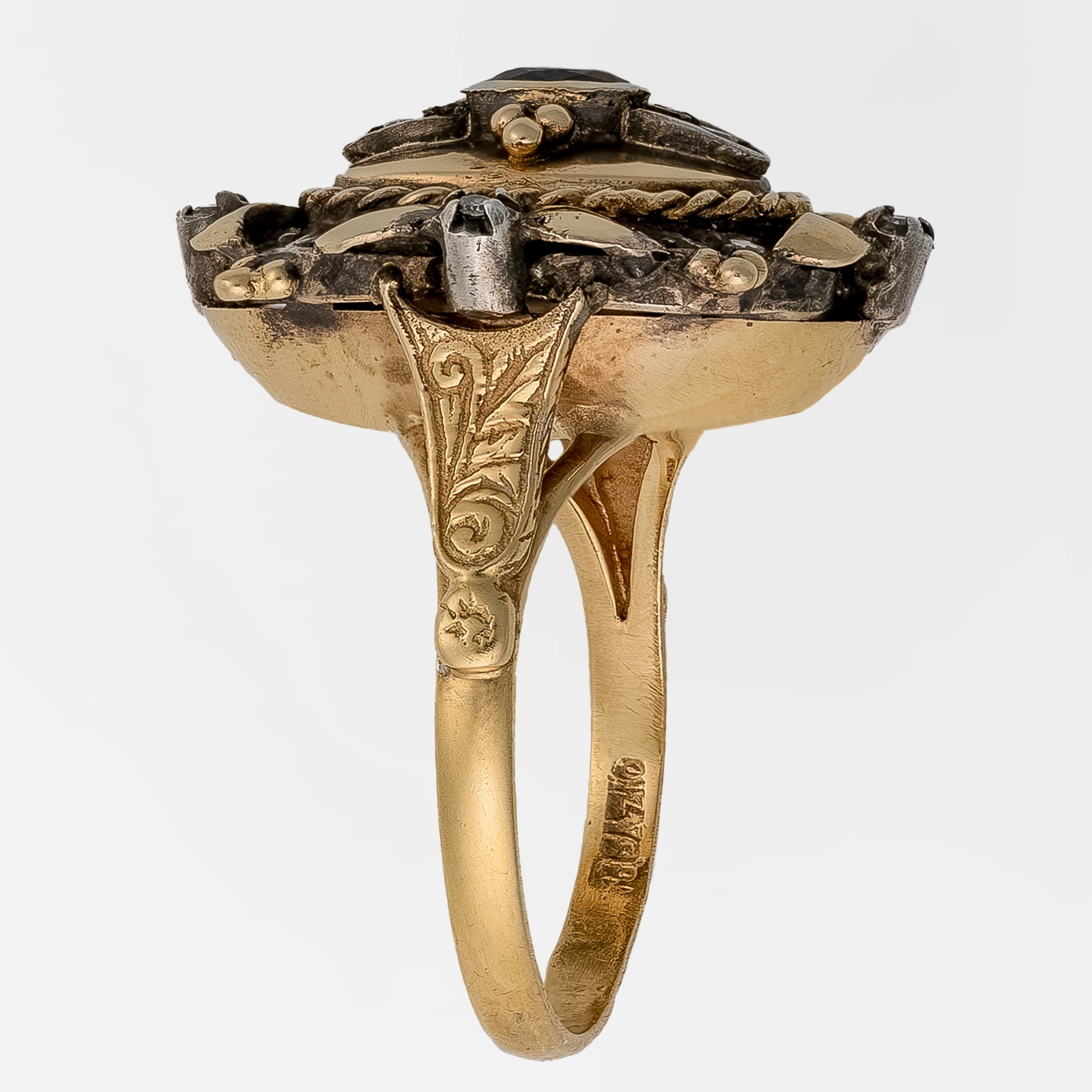 Niezwykła praca złotnicza wykonana ręką dawnego mistrza jubilerstwa. Srebrno-złota kompozycja zdobiona diamentami, rozetami diamentowymi oraz fasetowanym w owalu niewielkim szafirem. Piękno kamieni starego szlifu osadzonych w srebrze, ciemnogranatowy odcień szafiru podkreślony barwą starego złota oraz nietypowa konstrukcja czyni pierścionek absolutnie niepowtarzalnym rzadkim klejnotem na rynku biżuterii antykwarycznej.
