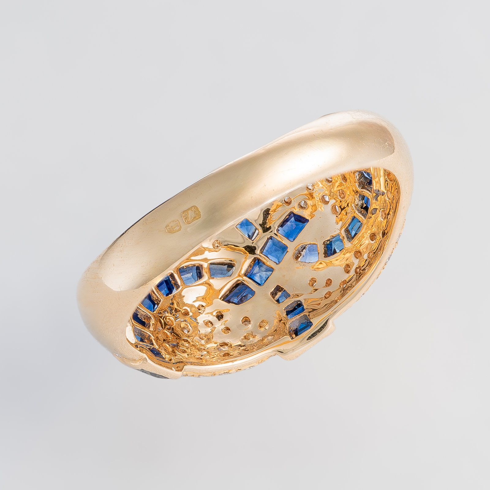 Forma pierścionka utrzymana w typie lekkiego sygnetu z fantazyjnym wzorem utworzonym przez diamentowo-szafirowy duet. Idealnie dobrana ponad setka wspaniale lśniących diamentów w zestawieniu z ciemnoszafirowymi korundami w szlifie bagiet.