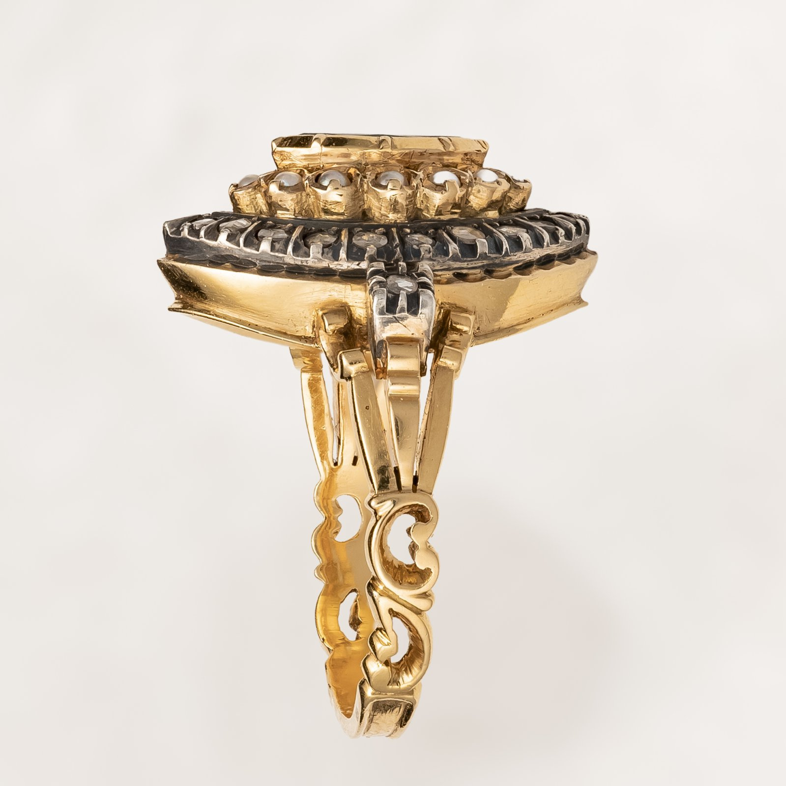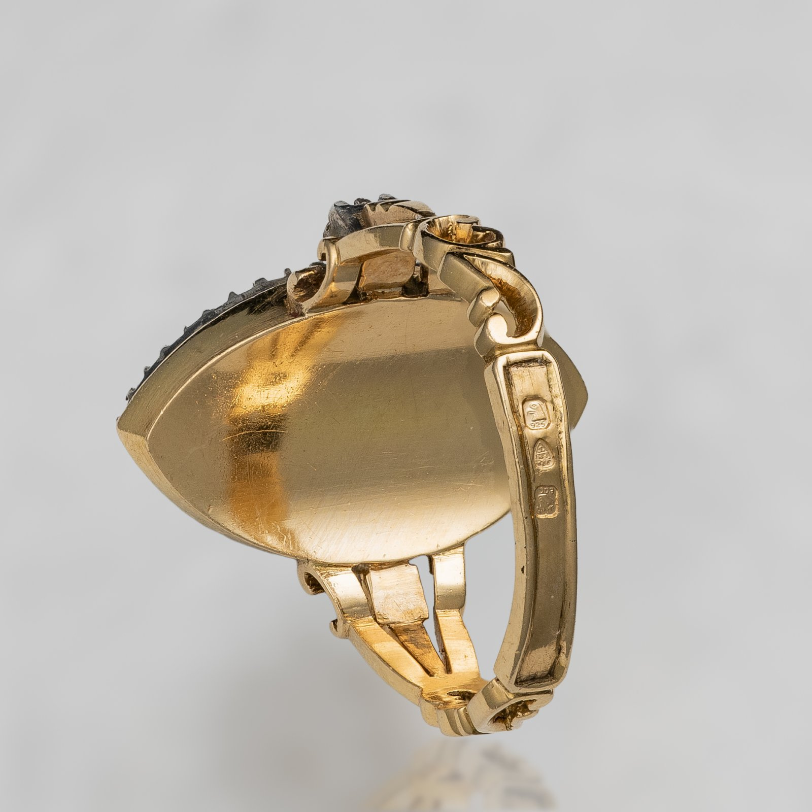Urzekająca forma mandorli ozdobionej szmaragdem w szlifie markizy oraz niewielkimi delikatnymi perełkami guzikowymi, których piękną kremową barwę podkreślają dyskretnie połyskujące diamenty w szlifach rozet. Całość ujęta w srebrno złotą oprawę typu abgedeckt - kasetową, zamkniętą. Pięknie wycyzelowana obrączka. Majstersztyk ręcznej pracy złotniczej.