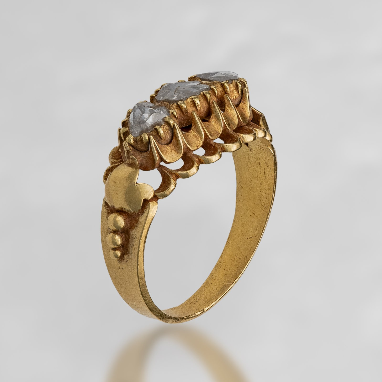 Niecodzienna triada w ręcznej pracy złotniczej wykonana z użyciem wysokiej próby złota. Pieczołowicie zakute w oprawę zamkniętą trzy wspaniałe rozety diamentowe, których subtelny blask wspaniale koresponduje z ciepłą barwą starego złota.