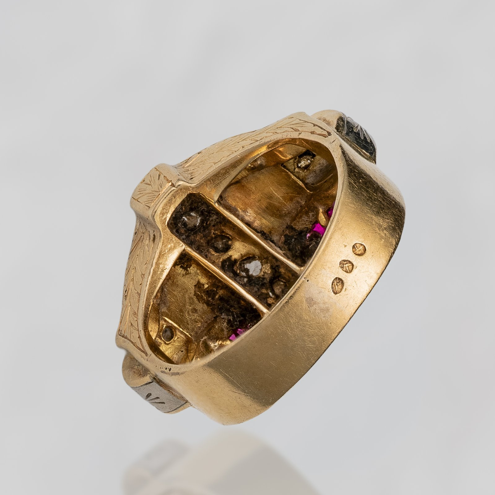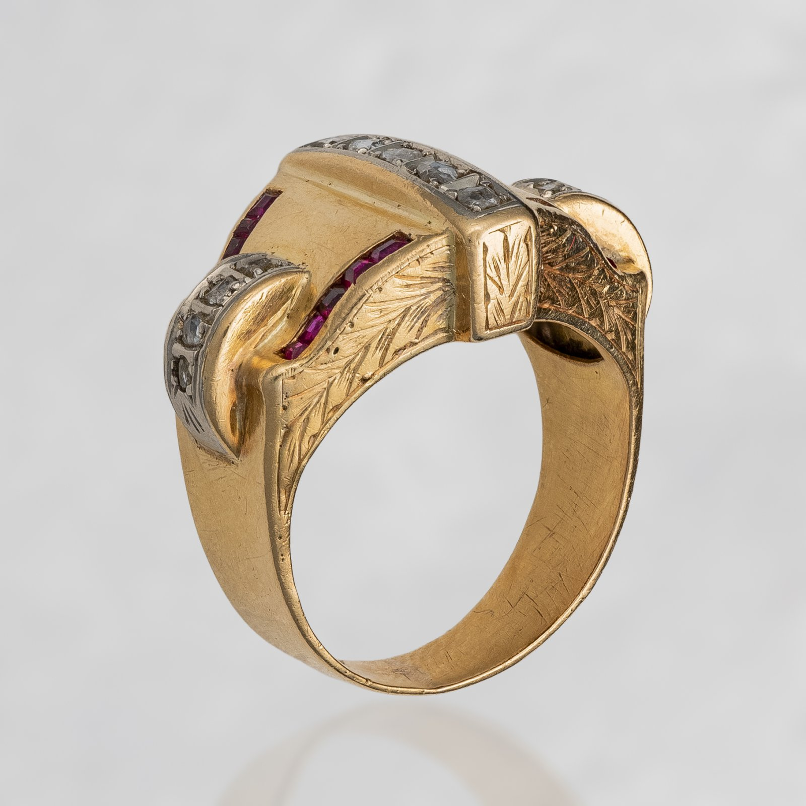 Rzadko spotykana konstrukcja pierścionka nawiązująca w swojej formie do niezwykle lekkiego sygnetu charakterystycznego dla epoki Art Deco. Biel połyskujących rozet diamentowych przełamana głęboko nasyconą czerwoną barwą historycznej syntezy rubinów. Dodatkowo zdobienie obrączki cyzelunkiem z motywem wawrzynu szlachetnego. Wszystko to świadczy o wysokim kunszcie artystycznym mistrza złotnictwa minionej epoki.