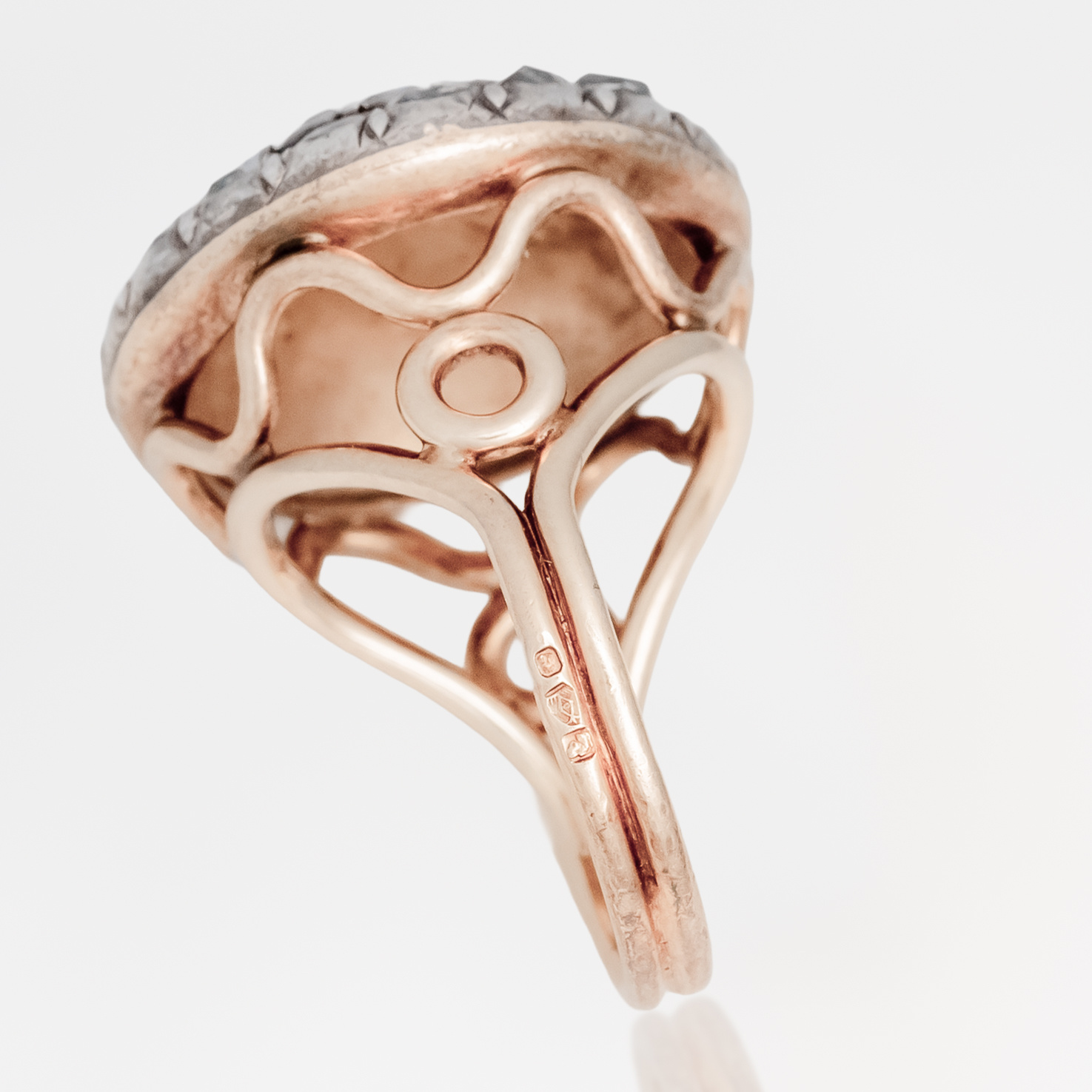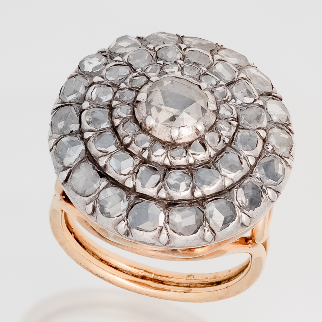 Pierścień w kształcie kopułki, gdzie w starej wykonanej ze srebra oprawie typu abgedeckt ( przykrywającej kamienie ) umieszczono 51 diamentów w szlifie rozetowym. Piękna przestrzenna forma złożona z trzech okręgów diamentów zwieńczonych niezwykle okazałą rozetą w starym szlifie wysokich faset. Obrączka oraz zdobienia boczne wykonane z 18 karatowego złota.