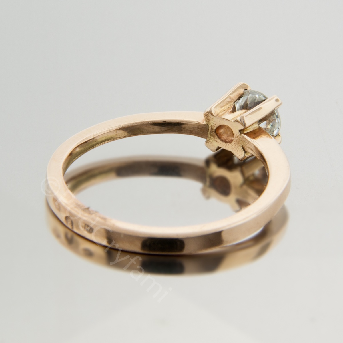 Pierścionek pasujący na każdą okazję. Zakuty w łapkach diament o szlifie brylantowym oprawiony w żółte złoto.