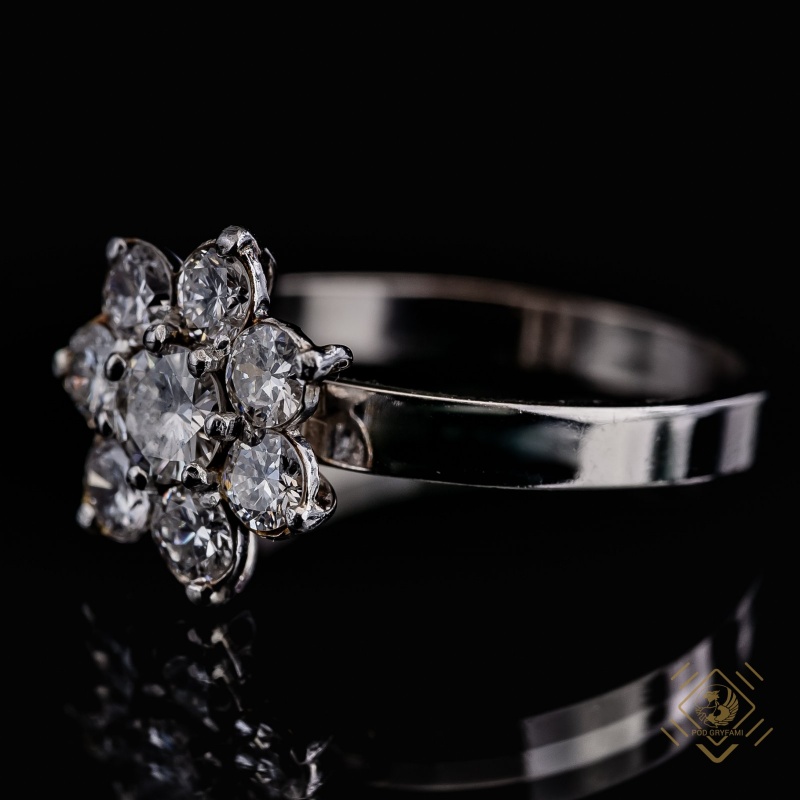A white gold ring in the form of a daisy flower, whose petals are decorated with carefully selected diamonds. Delicate hand decoration for every day wearing or a night out.