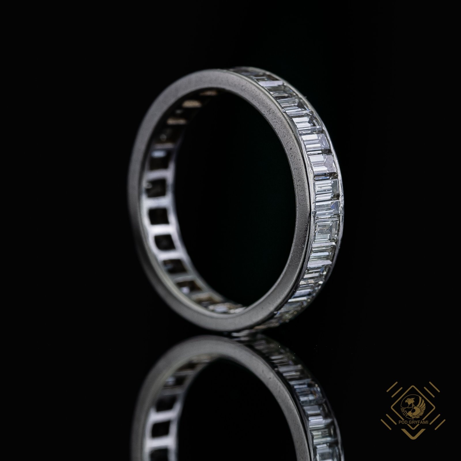 Klasyczna obrączka wykonana z platyny ozdobiona diamentami o szlifie bagiet. Znakomicie prezentuje się na dłoni solo jak i w duecie z innym pierścionkiem.