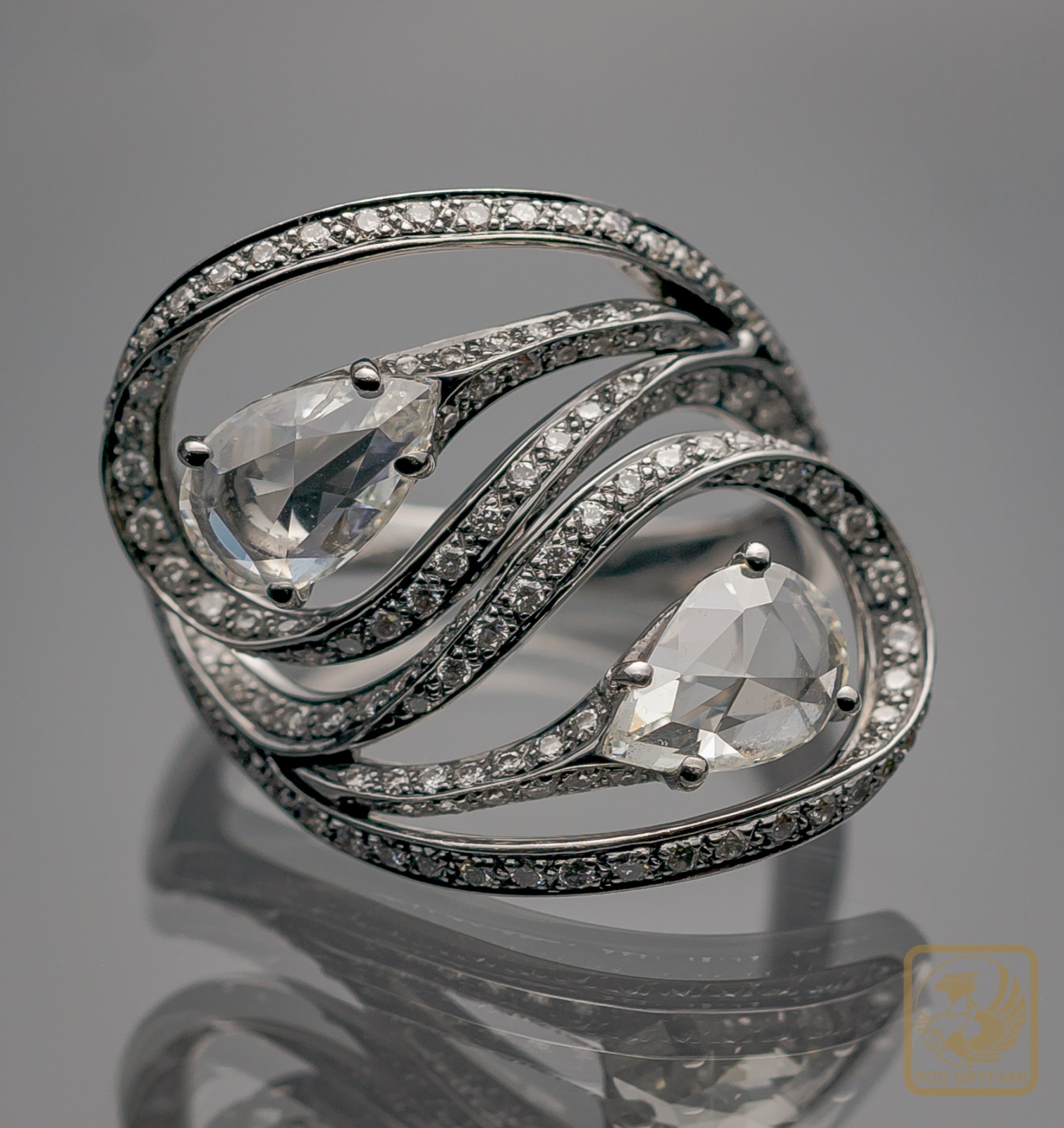 Piękny zaręczynowy pierścionek symbolizujący nieskończoność miłości… Dwie diamentowe rozety, kunsztownie osadzone w ruchomych koronkach, mienią się tysiącem barw rozproszonych promieni światła. Efekt podkreśla cieniowana srebrem złota obrączka obsadzona brylancikami.