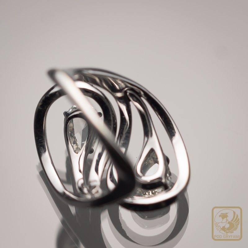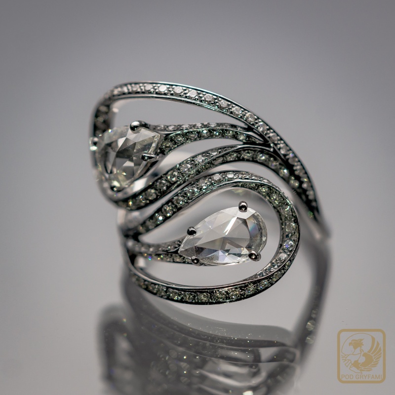 A beautiful engagement ring symbolizing the infinity of love... Two diamond rosettes, artistically set in moving laces, sparkle with thousands of colors of scattered rays of light. The effect is emphasized by a silver-plated gold ring with diamonds.