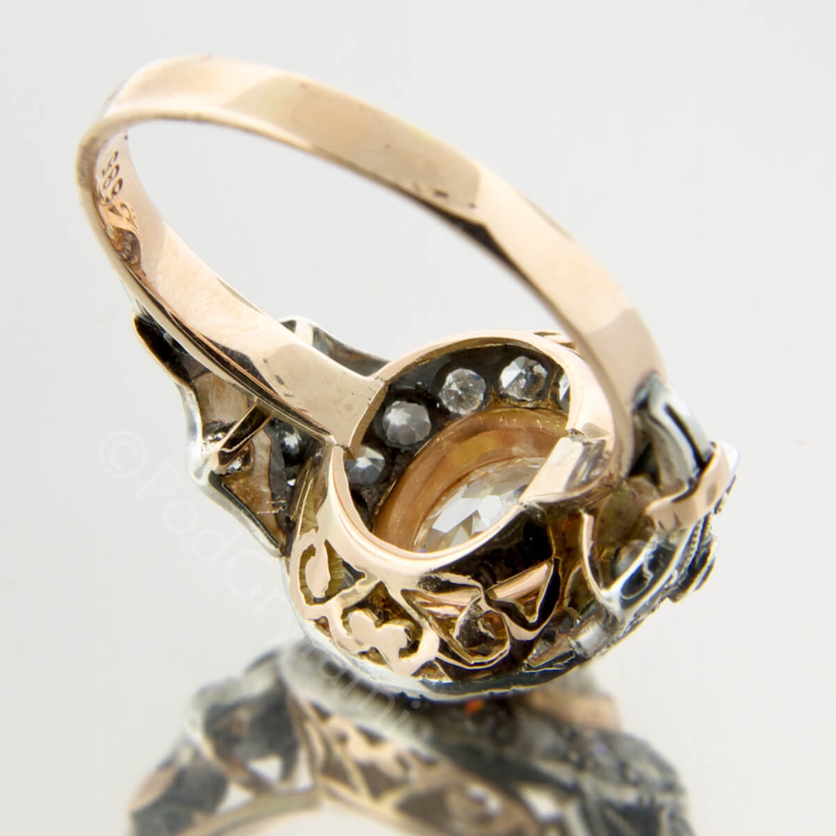 Klejnot z ,,duszą”. Ponad półtora karatowy diament (1,70ct) o szlifie old mine osadzony centralnie w oprawie ciągłej ozdobiony 22 sztukami diamencików oprawionych w korny. Całości dodaje smaczku punca wiedeńska z lat 20-tych XX wieku świadcząca o tym,że pierścionek ,,skomponował” jeden z wiedeńskich wirtuozów jubilerskich. Proweniencja: Wiedeń