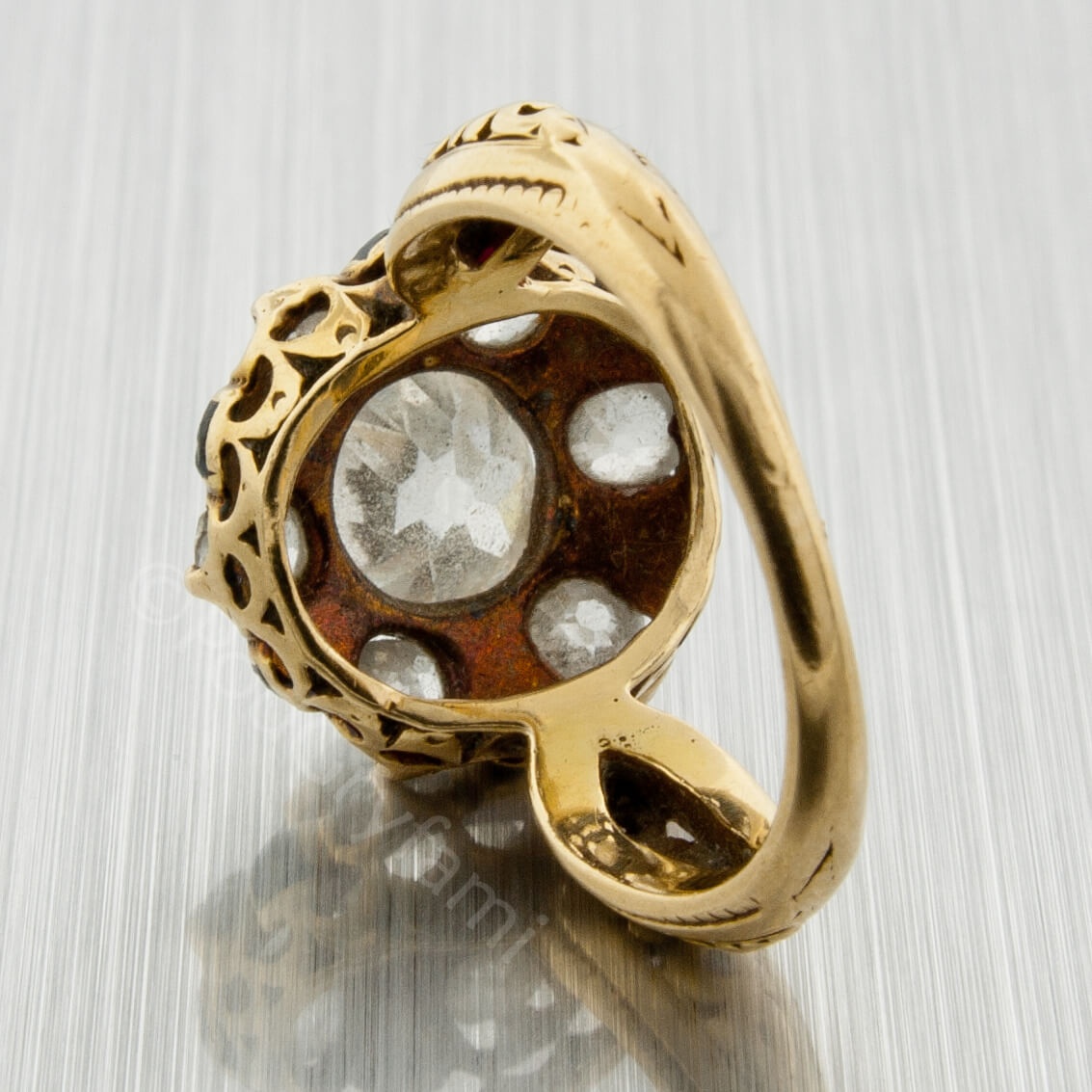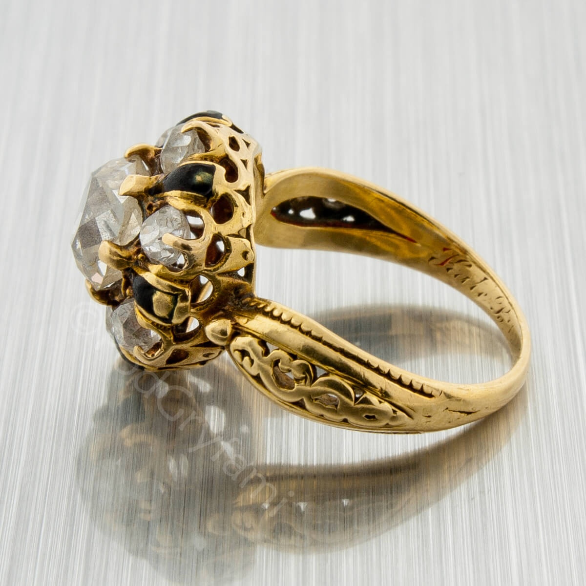 Niezwykle delikatnej urody pierścionek wykonany ze złota ok 18 karatowego z diamentami o starym szlifie (old mine) ozdobiony czarną emalią. Od wewnątrz umieszczona grawerka z dedykacją: Kate TB(?) Johnson-Theodora 1864. Wygrawerowana data sugeruje,że klejnot powstał w okresie wiktoriańskim charakteryzującym się wzrastającą zamożnością , dobrobytem i rozwojem nowych technologii. Biżuterię z tego czasu można podzielić na trzy okresy (1837-1855). Romantyczny, (1856-1880) Wielki oraz (1880 – 1900) Estetyczny. W drugim okresie tzw Wielkim powstały najbardziej efektowne precjoza inspirowane motywami Dalekiego Wschodu. Do ich wyrobu oprócz diamentów używano kamieni szlachetnych o ciemnych, stonowanych barwach oraz emalii o wszelkich odcieniach czerni. Tak więc, jest to typowo wiktoriański wyrób a dodając do tego fakt iż pierścionek był eksponowany na wystawie w Nowojorskim Muzeum Miejskim można stwierdzić,że jest to wysokiej klasy niepowtarzalny klejnot wykonany na indywidualne zamówienie.