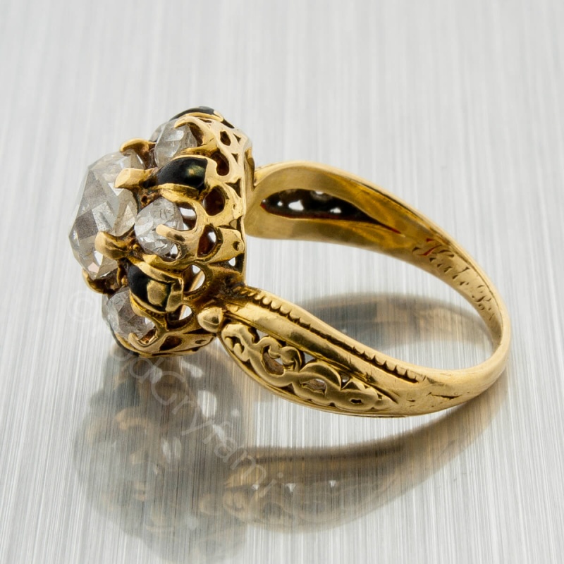 An extremely delicate ring made of approx. 18k gold with old mine cut diamonds and decorated with black enamel. On the inside there is an engraving with a dedication. The engraved date suggests that the jewel was created in the Victorian period, characterized as it was by increasing wealth, prosperity and industrial development. Jewelry from this period can be divided into three periods: Romantic (1837-1855), Great (1856-1880) and Aesthetic (1880-1900). In the second half of the so-called Great Period, the most impressive preciosity inspired by the aesthetics of the Far East was created. Apart from diamonds, precious stones of dark, subdued colors and enamels of all shades were used for production. Thus, this piece is a typical Victorian product. Adding to the fact that the ring was on display at the Museum of the City of New York, we can say with certainty that it is a highly unique jewel, made to order.