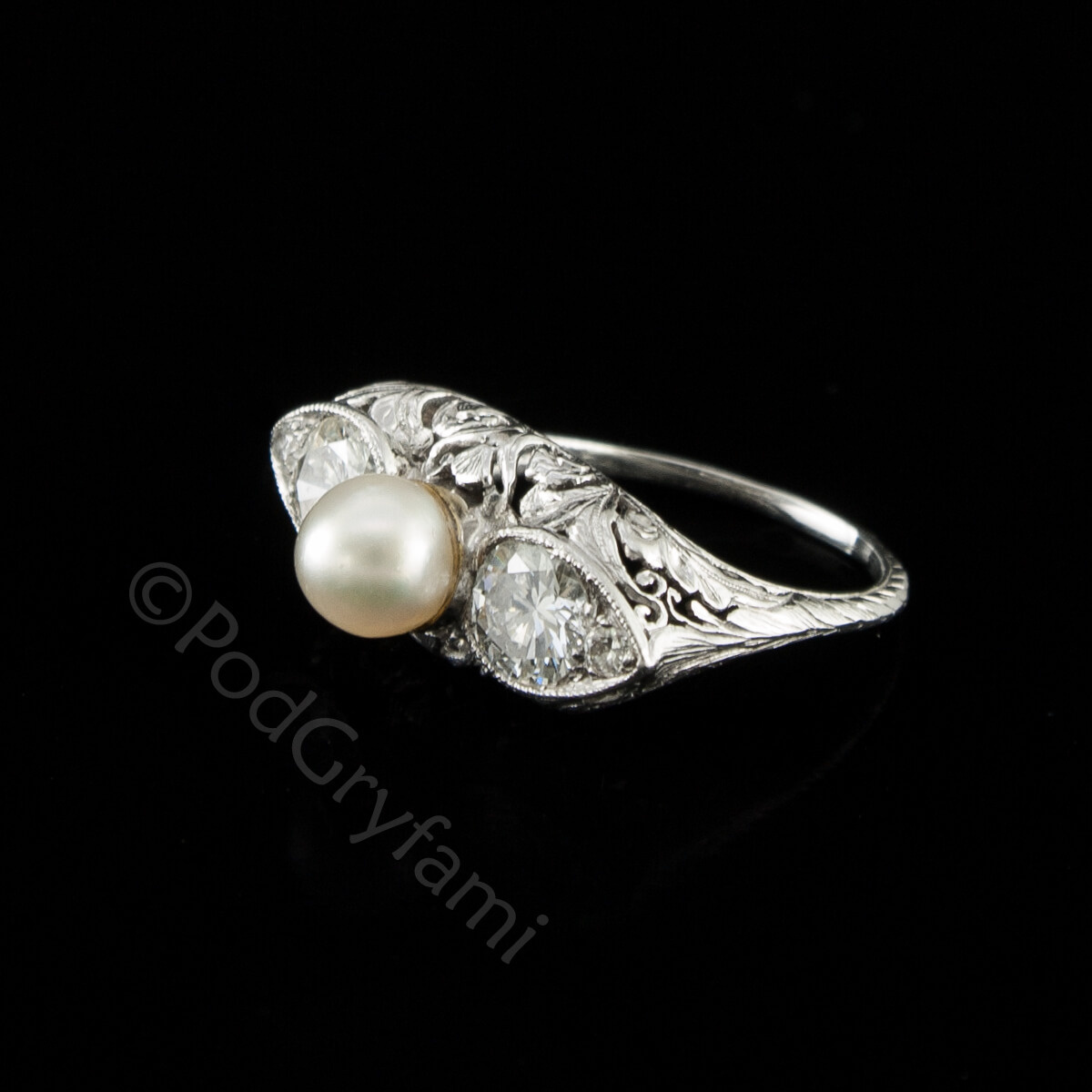 Niewielki klejnot przyciągający uwagę ciekawym nowatorskim kształtem. Platynowa wijąca się niczym liana wokół palca obrączka w górnej części przechodzi w ażurowy, floralny ornament. Kunszt mistrza złotniczego objawia się w cyzelunku uwidaczniającym delikatne żyłki tzw unerwienie filigranowo giętych listków. Ciekawie osadzone brylanty tworzące jakby dwa płatki kwiatu, którego wypełnieniem jest centralnie osadzona w białym złocie - idealnie okrągła perła. Zachwyca urodą ,,epoki piękna”.