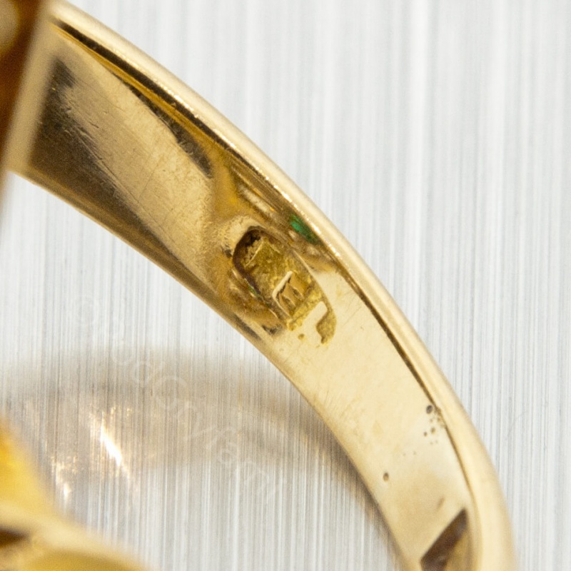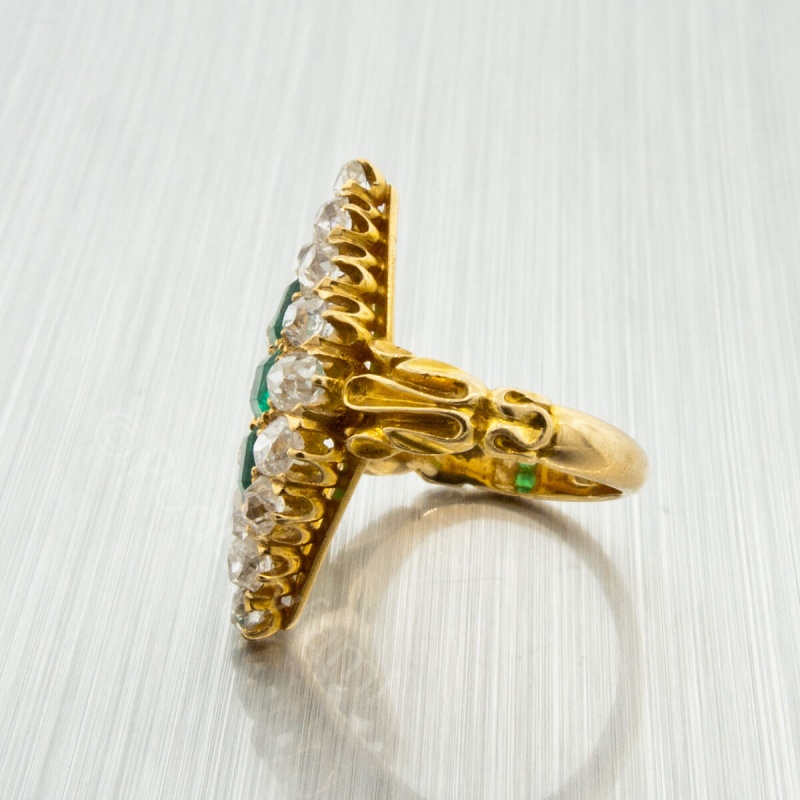 Three beautiful polished emeralds, placed among old mine cut diamonds. A lovely palm decoration in the color of sea foam.