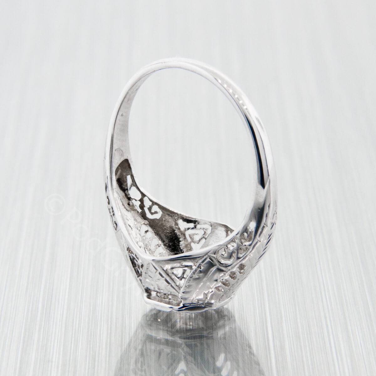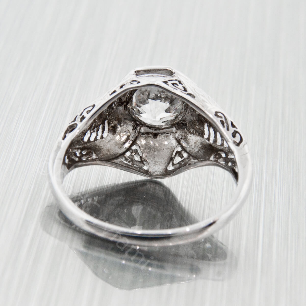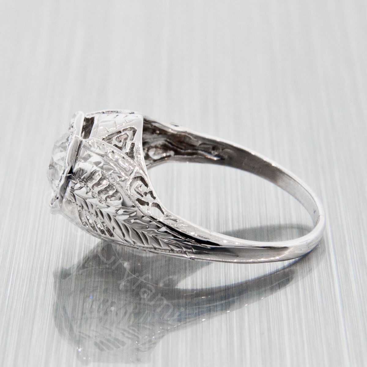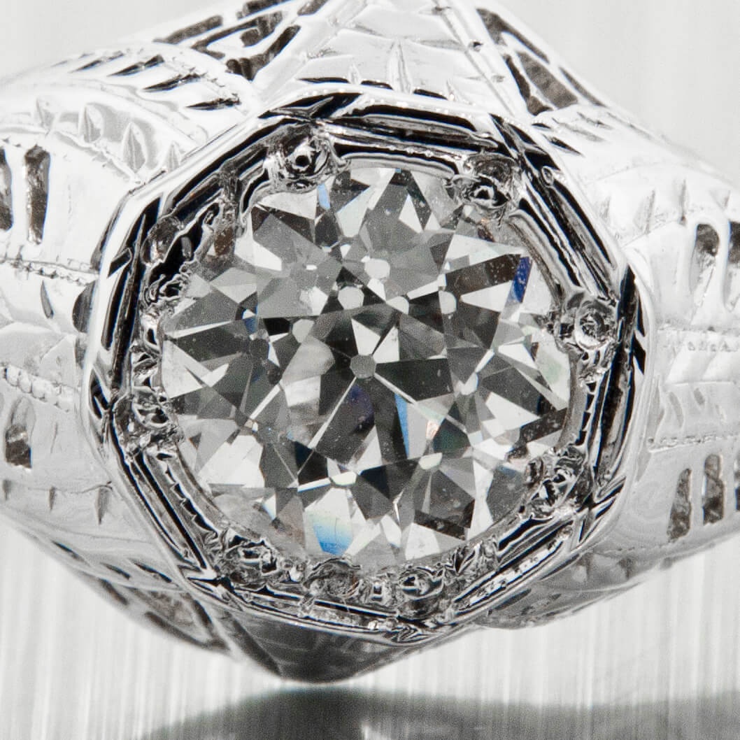 Ponad karatowy diament w starym szlifie historycznym oprawiony w bogato cyzelowaną obrączkę wykonaną z białego złota.