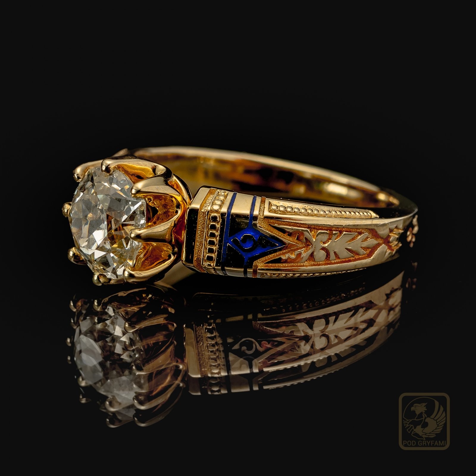 Niecodzienne połączenie ponad jedno karatowego diamentu o starym szlifie z niezwykle pięknie stylizowaną oprawą. Delikatny cyzelunek obrączki muśnięty błękitną emalią.