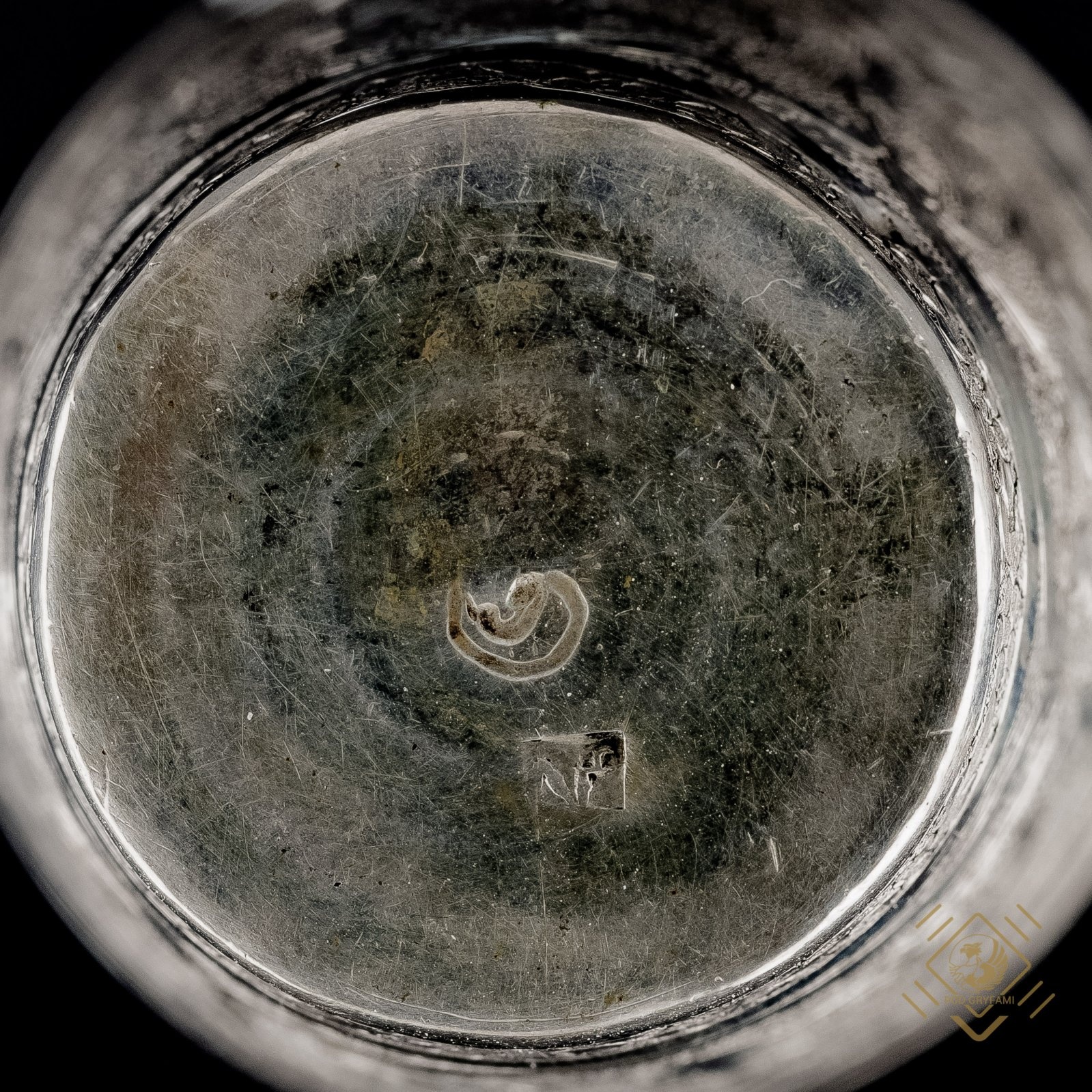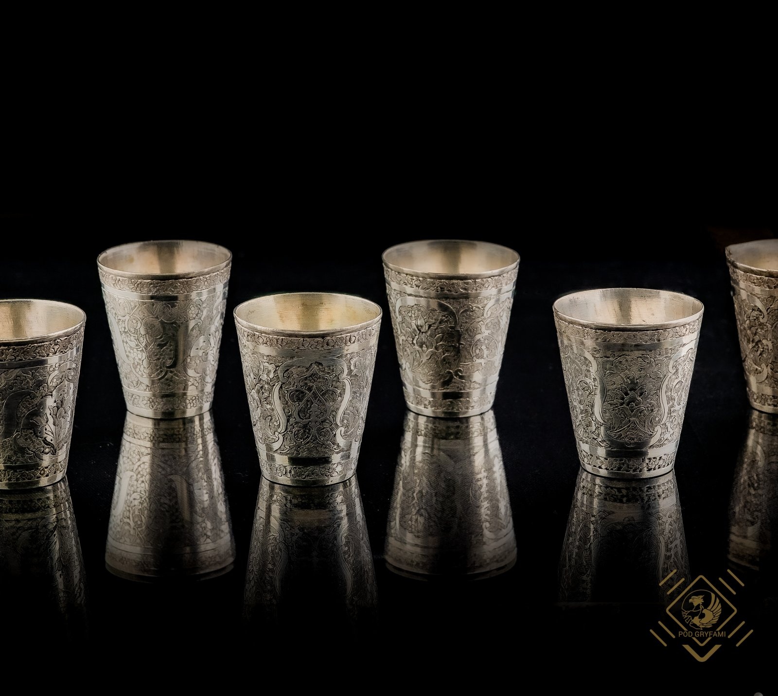 Komplet 6 sztuk kieliszków wykonany ze srebra. Punce umieszczone na spodzie każdej sztuki, nieco zatarte. Kieliszki zdobione ornamentami roślinnymi. Cztery sztuki o identycznym wzorze, dwie kolejne - inny wzór nawiązujący w stylistyce do czterech poprzednich.