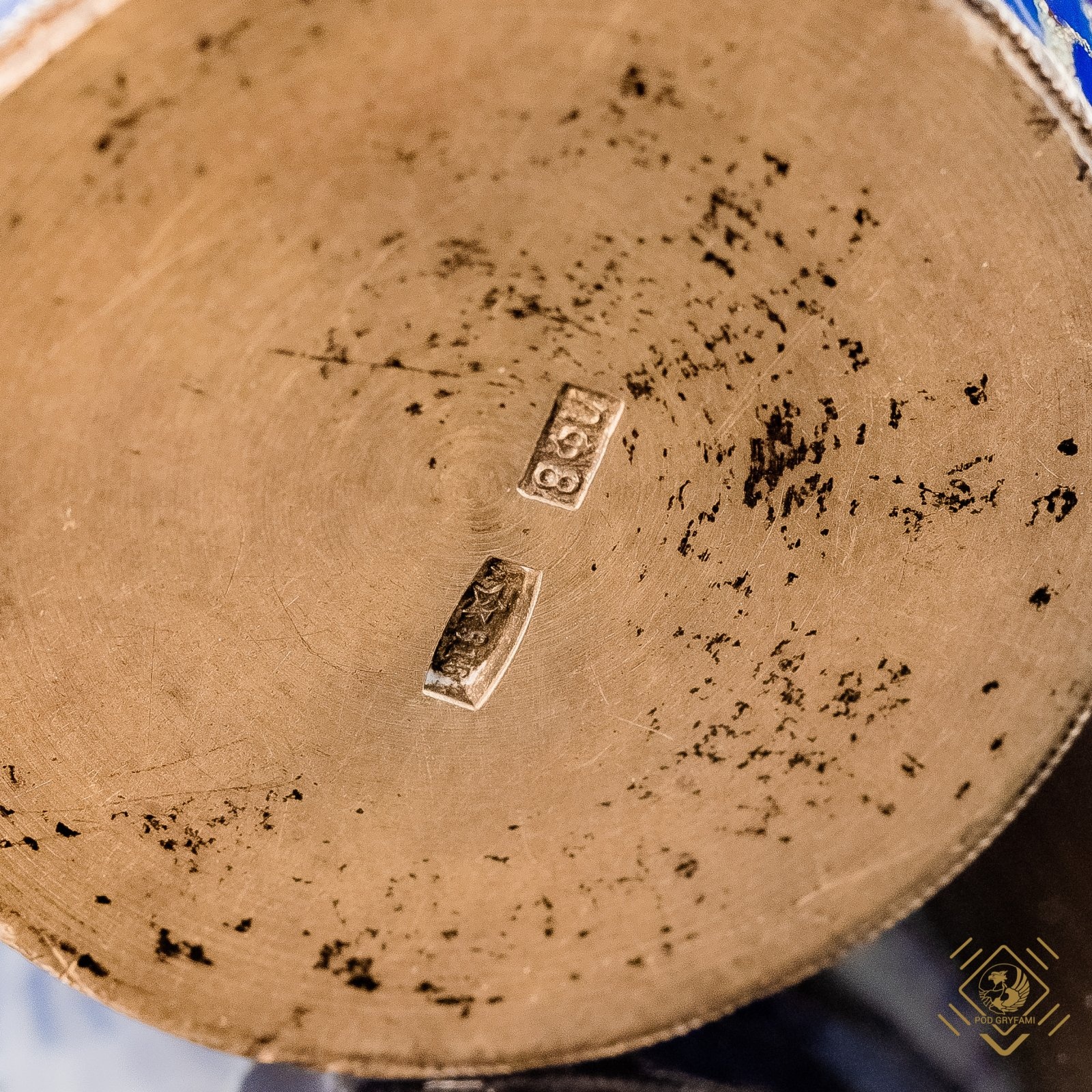 Para kieliszków wykonana ze srebra, wewnątrz złocona, ozdobiona emaliami. Kieliszki można nabyć pojedynczo.