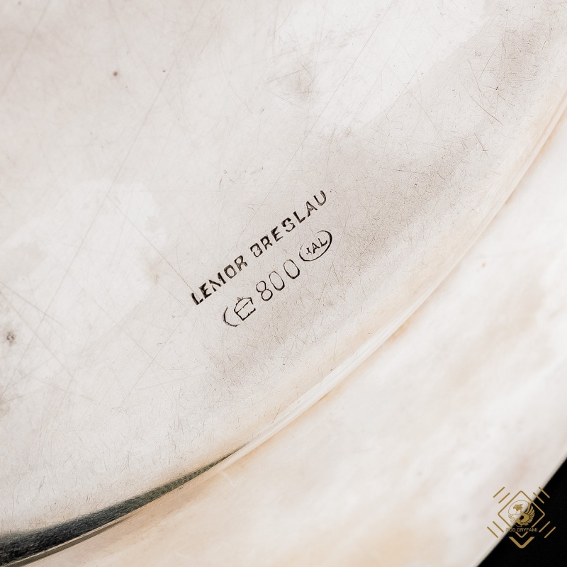Smooth platter / plate made of silver. Engraving: LEMOR BRESLAU, crescent moon, crown - German hallmarks, 800 silver fineness and an oval JAL master's mark (used since 1897).