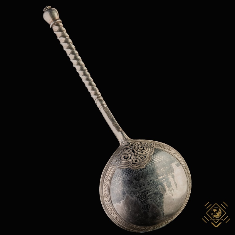 Beautiful service ladle made of silver, decorated with architectural niello. On the back of the handle is the date 1864, and the silver test 84, as well as (B.C) the initials of the Moscow tester of Wiktor Savinkov, active from 1855-1888, and the city symbol of Moscow - Saint George.