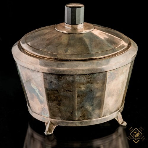 Prezentowana bombonierka została wykonana ze srebra w klasycznym stylu Art Deco. Wsparta na czterech nóżkach czara ze szczelnie przylegającą pokrywą.