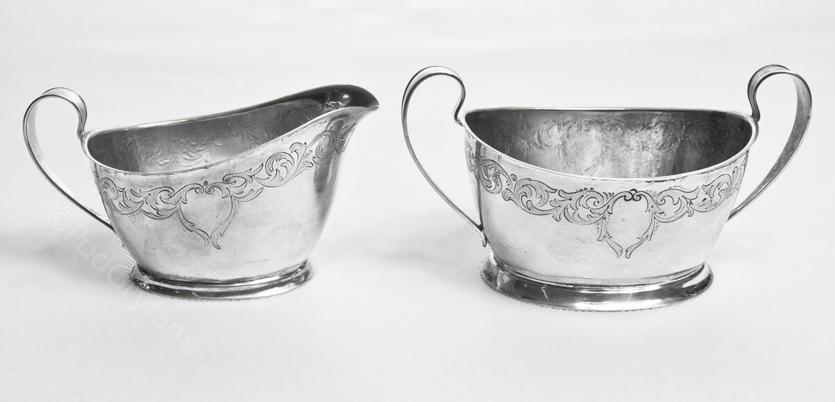 Notatka: Mlecznik: 1929 rok, Waga 102 g, Długość 10.5 cm, Szerokość 7 cm, Wysokość 6.5 cm, Cukiernica: 1929 rok, Waga 135 g, Długość 10.5 cm, Szerokość 8 cm, Wysokość 7.5 cm,